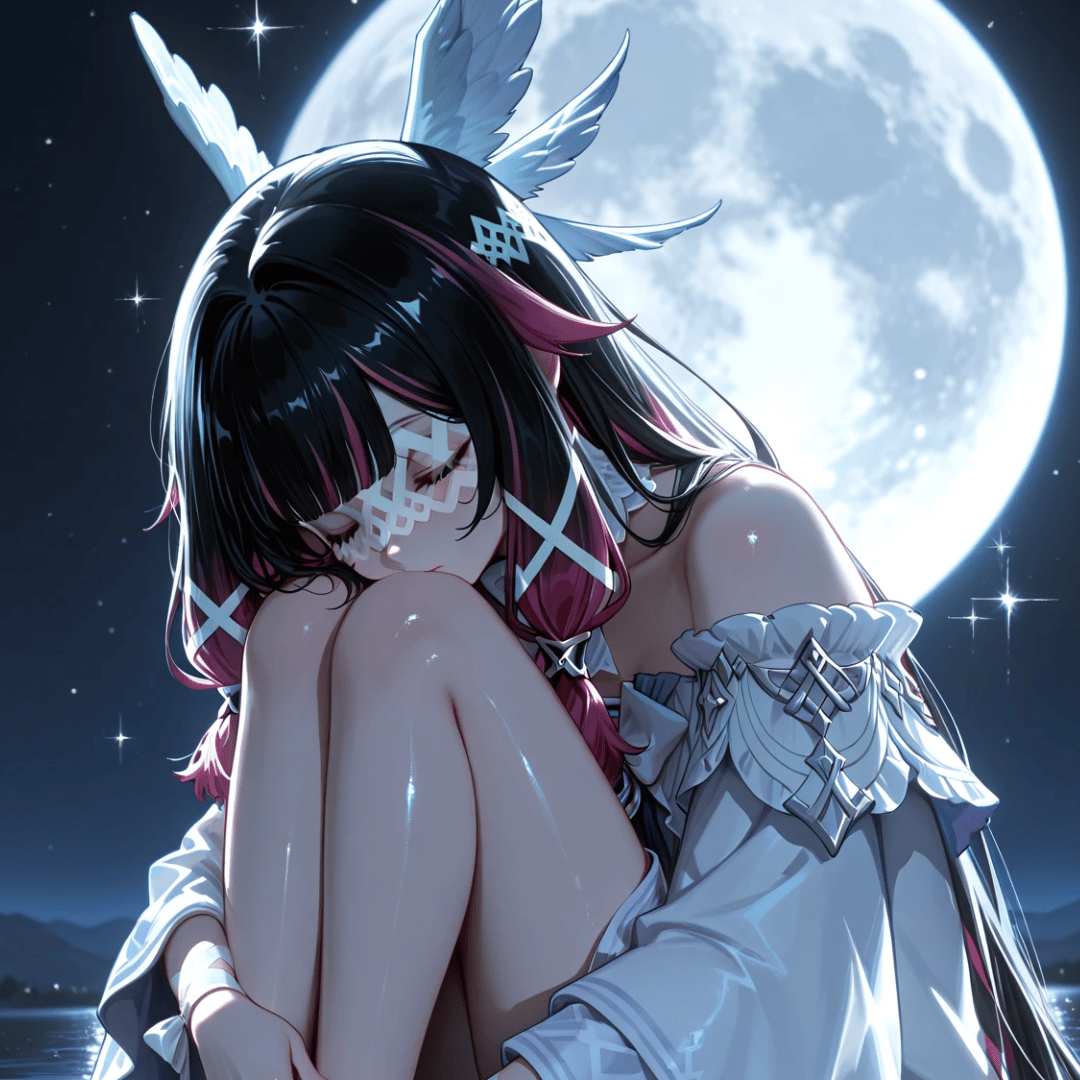 Floating just above the water’s surface, she hugs her knees close, cradled by silver light from the moon she seems almost connected to — calm, distant, and quietly divine. Soft ripples shimmer below, her hair and ribbons drift with subtle motion, and the night air glows with a peaceful, dreamlike atmosphere.