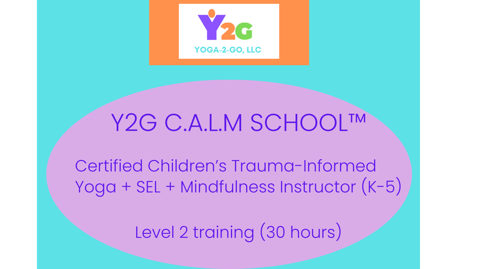 A 30-hour online/self-paced Level 2 certification training leading to the Y2G C.A.L.M SCHOOL™ Children's Yoga + SEL + Mindfulness Teacher Certification