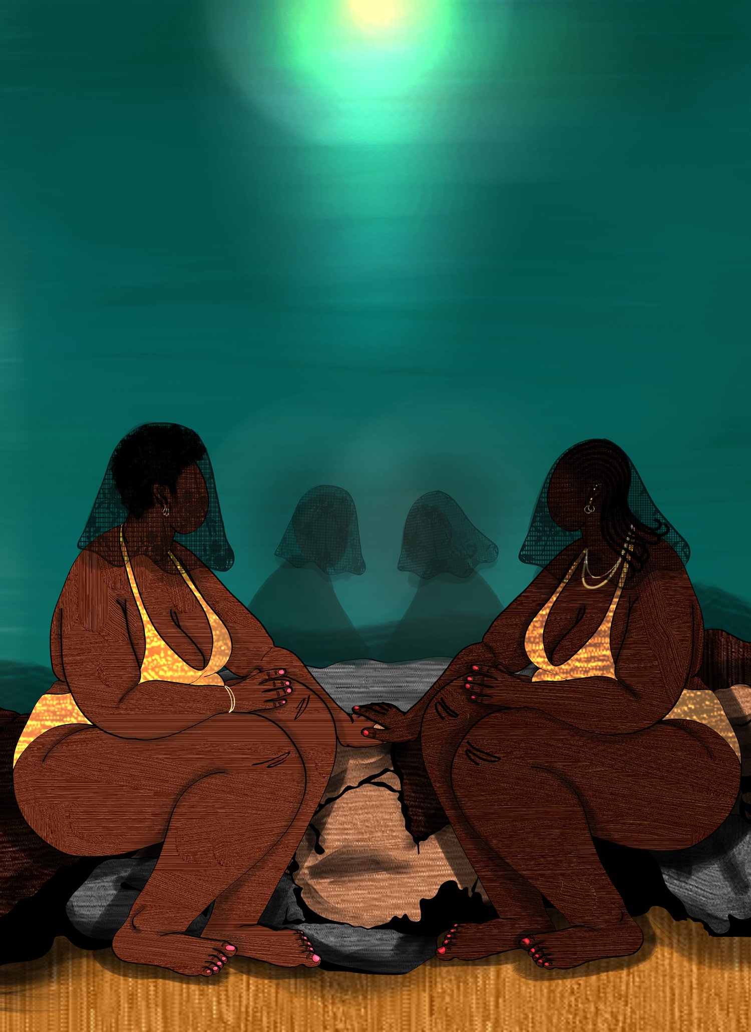 A pervasive reality about living under an oppressive world order is perpetual grief. We are constantly grieving from the trauma of being marginalized, state neglect, and violence, from the scarcity and loss of safety and freedom and even life. A form of grief I wanted to give space to in my ongoing series exploring intimacy in the absence of liberation is the grief of all the possibilities we lose to oppressive realities. The selves we don’t get to become because so much of our lives are spent in survivorship, survival mode, and resistance. In ‘a eulogy for who we could have been if we were free’ I wanted to convey the dissonance of experiencing leisure while holding deep grief. I wanted to convey this by depicting a couple seated on some rocks on a beach, in dazzling metallic swimsuits, with their heads covered in black lace scarves usually worn in funerals. In the artwork, the couple are shown sitting with their legs pulled up and arms bent over their bellies and their hands gently placed over one another, offering comfort. They are also looking out into the water, where the reflection of the sun can be seen in the distance. Their posture and closeness, and the direction they are facing all point toward a moment of solemnity about the loss of who they feel they could have been if they were free.