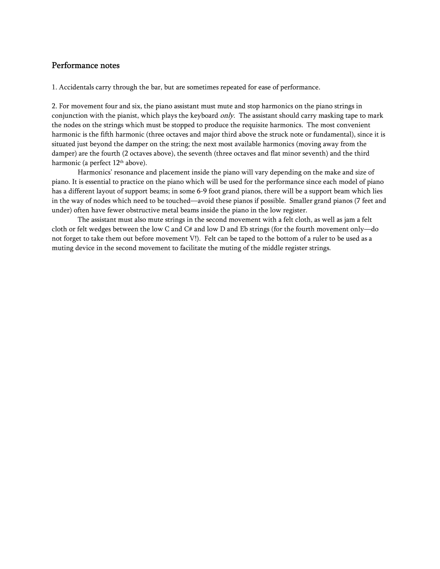 The Kulintang Suite for violin, piano and assistant is a set of pieces based on and inspired by kulintang gong melodies. All but the first melody are based on real kulintang pieces. Many of the original melodies are distorted, contracted and re-pitched for expressive reasons. In movements II, IV and VI, the assistant mutes and or stops the piano strings, turning the piano into a gong-like percussion instrument. The Kulintang Suite was commissioned and premiered by Yuki Numata, Ming-Hsiu Yen on piano, and the composer as the assistant at Ms.Numata's Master's Degree Recital at the University of Michigan in March of 2006.