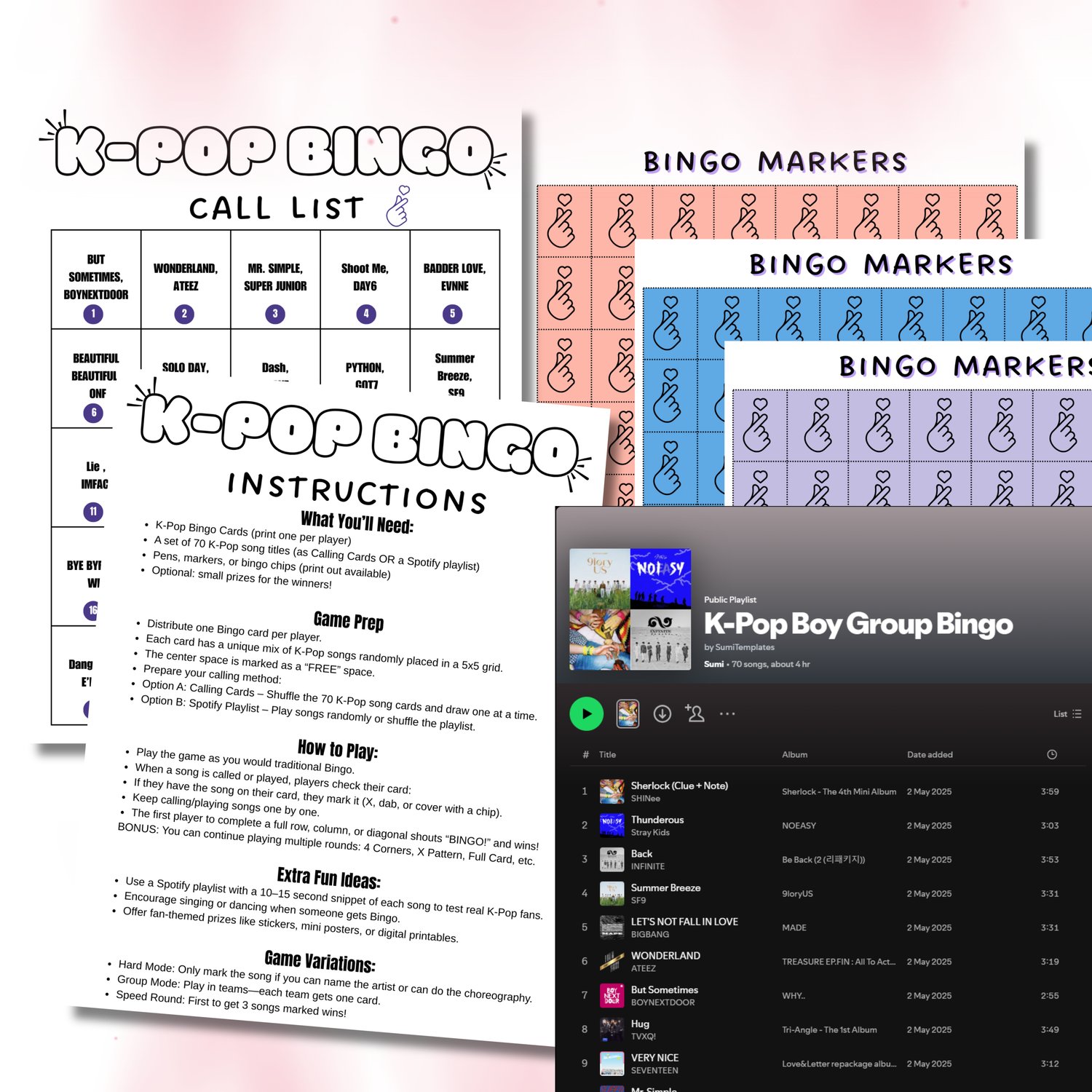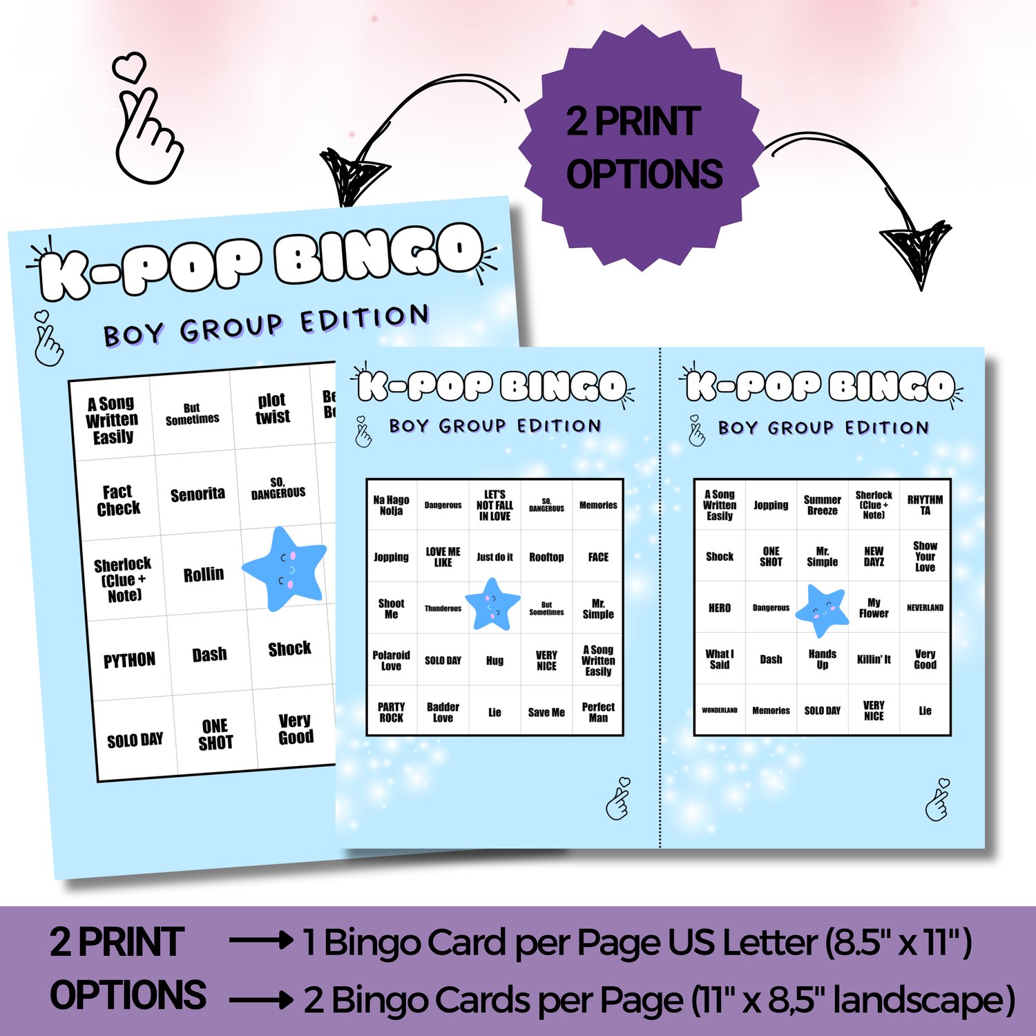 Instantly download 50 unique bingo cards featuring songs from legendary and trending boy groups—perfect for cupsleeve events, K-Pop game nights, birthdays, slumber parties, and more.
