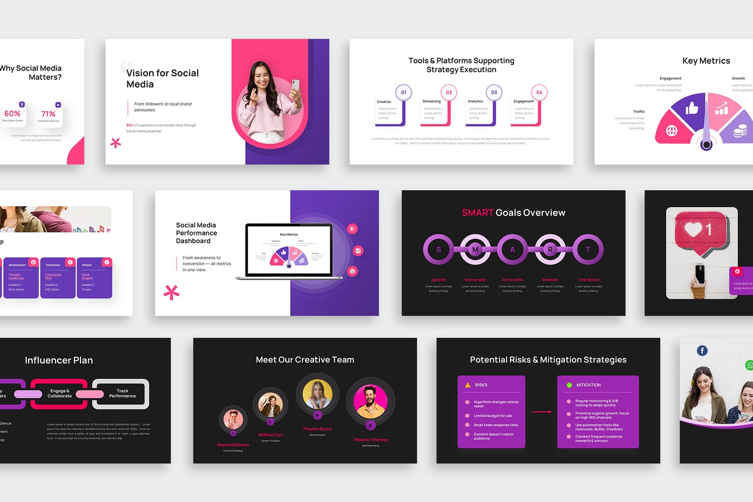 Featuring infographics, device mockups, charts, and data visualizations, it’s perfect for presenting social media goals, campaign performance, KPIs, and audience insights.