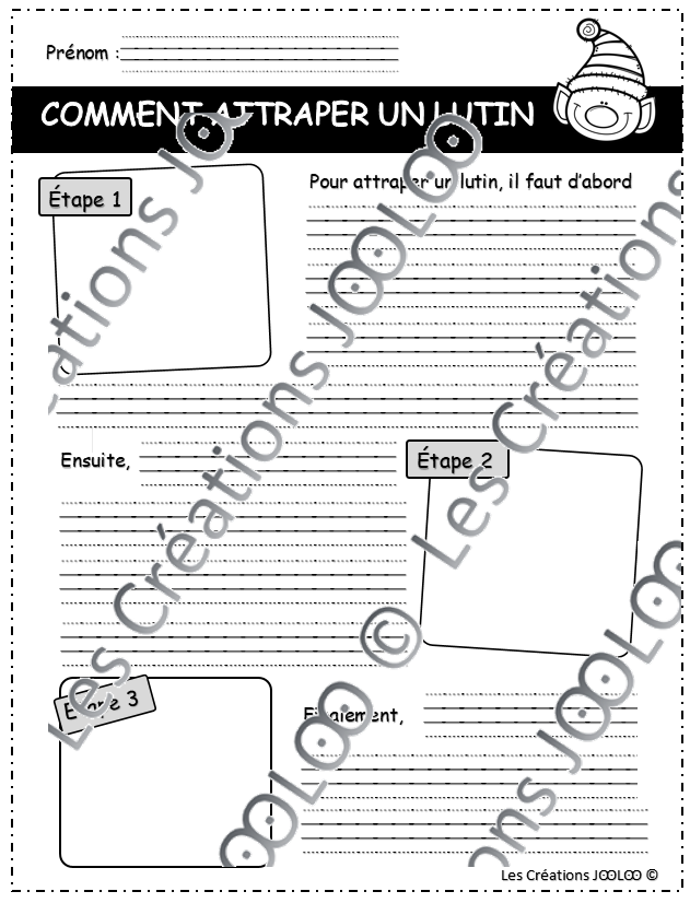 Voici une situation d'écriture clé en main pour les élèves du 1er cycle afin de travailler le texte courant explicatif. L'élève doit expliquer une procédure pour attraper un lutin à l'aide des mots donnés à l'appui. Pour ce faire, il doit d'abord faire un plan de son piège à lutin et expliquer brièvement les étapes qu'il faut réaliser pour attraper un lutin. Par la suite, à l'aide d'un plan-gabarit, il pourra écrire des phrases pour expliquer sa procédure. Une fiche d'autocorrection lui permettra de corriger ses phrases.