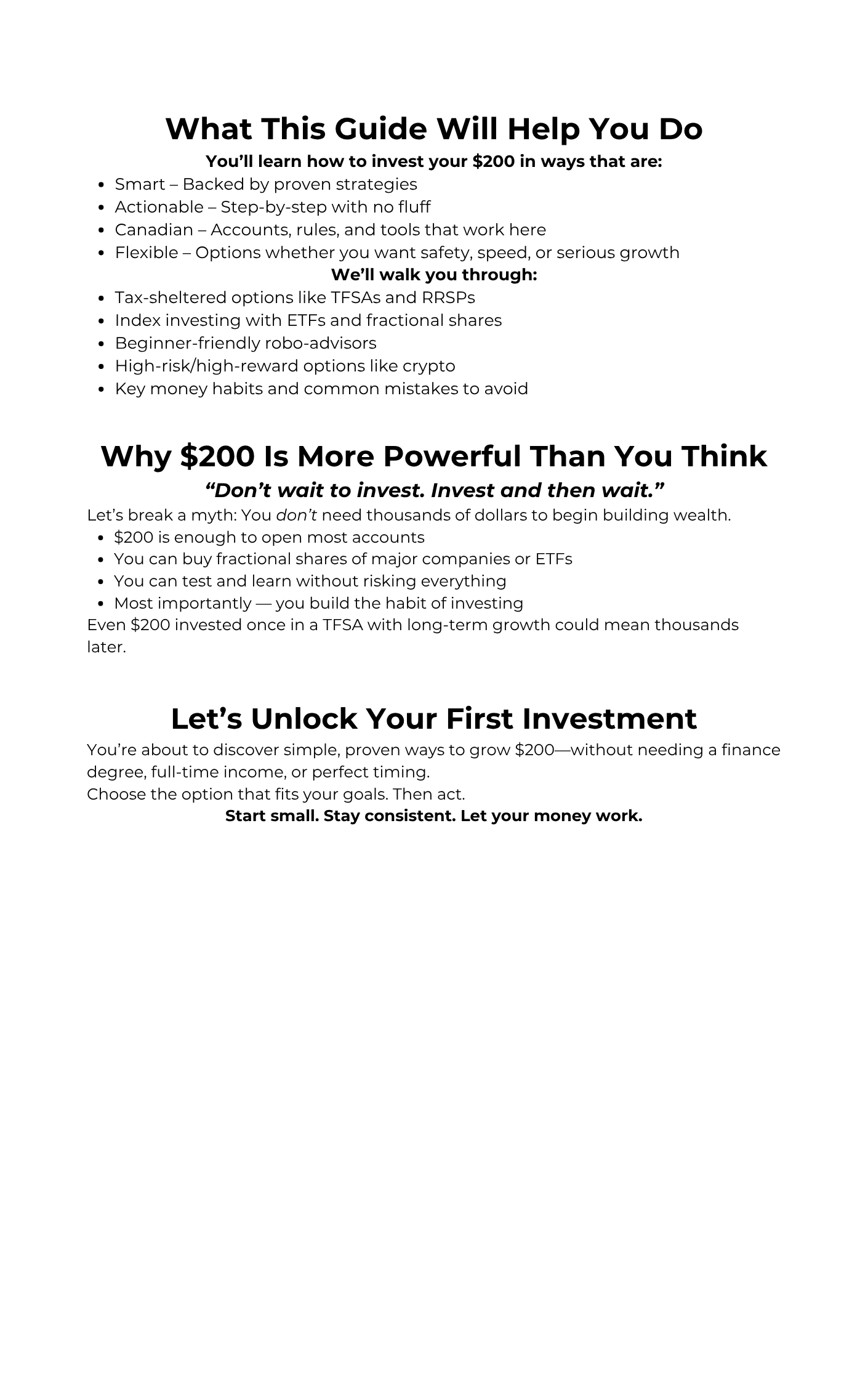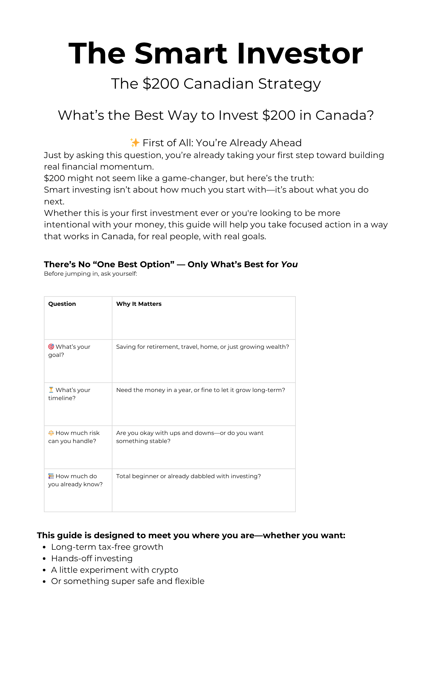 Ready to take control of your finances without the confusion? "The Smart Investor" is your step-by-step guide to turning just $200 into a growing investment portfolio—specifically designed for Canadians.