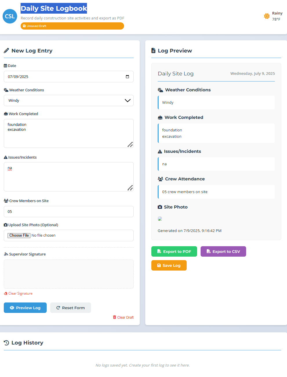 Daily Site Logbook is a simple, professional web application designed for construction managers, site supervisors, and field engineers to log daily activities, crew attendance, incidents, and site conditions — all from a browser.
