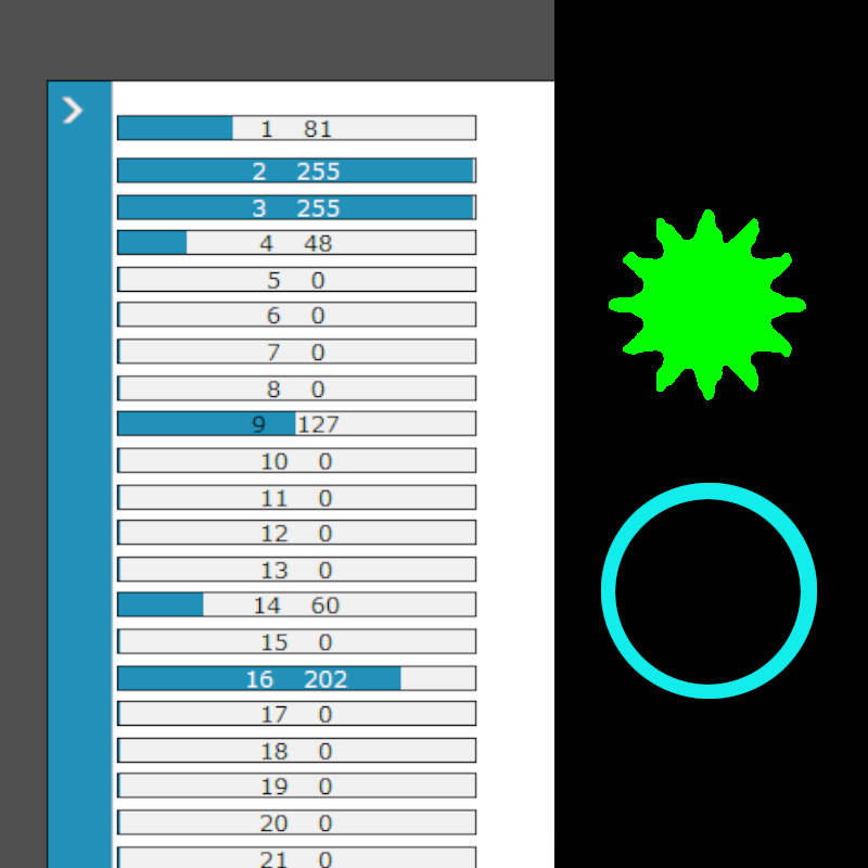 * Verifique, con un Fixture de pruebas (click), que coincidan estos canales: 16 en el valor 202 = Lámpara ON, 3 Dimmer, 2 Strobo/Shutter, 1 en el Valor 81 = Color Verde, 14 en el valor 60 = Aro Celeste, 4 en el valor 48 = Gobo de Sol, 9 Foco (ver tercer foto).