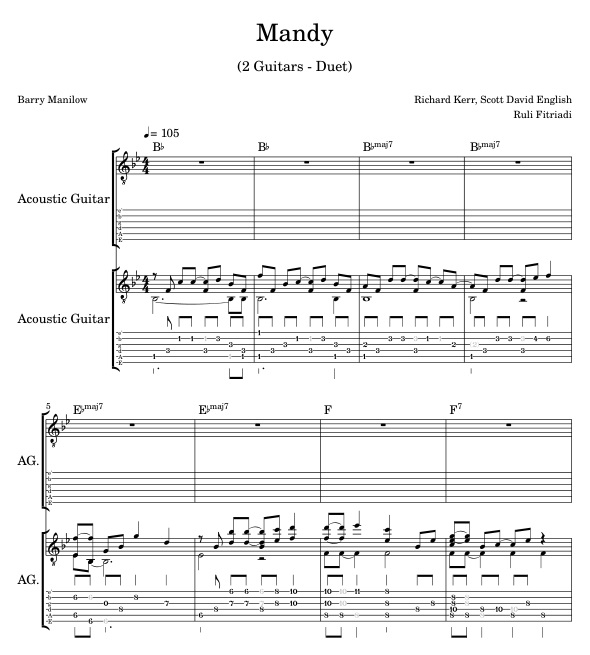 Barry Manilow - Mandy | 2 Guitars Duet Notes Tabs PDF Audio