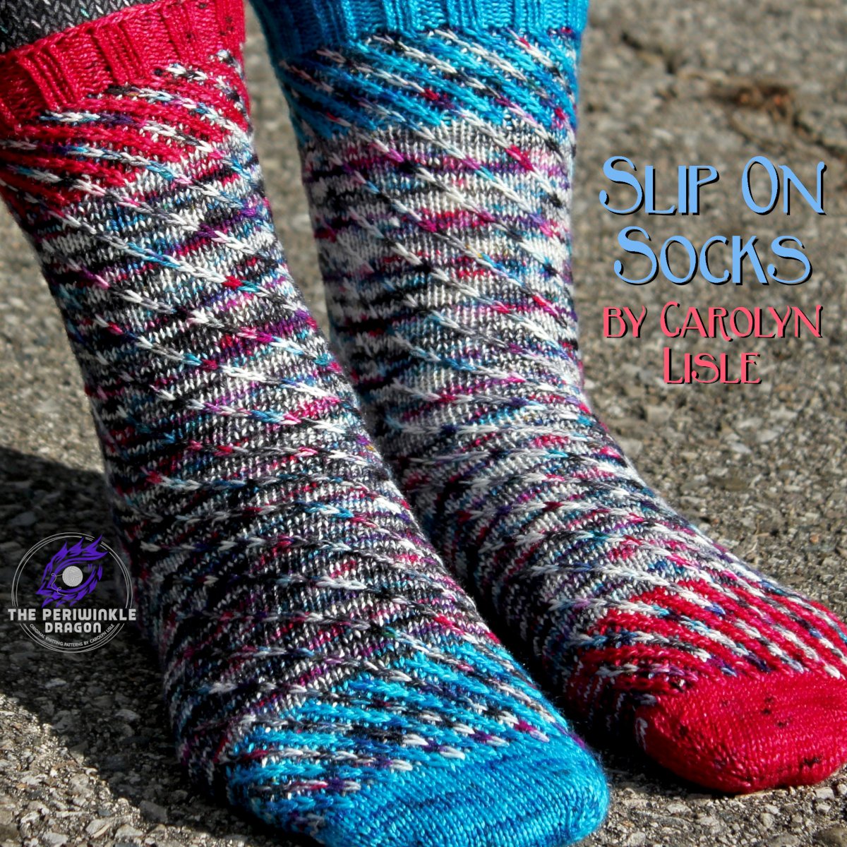 The Slip On Socks are a great way to have fun with minis, sock sets, and wild yarns! Grab that busy skein of sock yarn, choose a couple of minis that go with it, and work this fun and easy slipped-stitch pattern to bring them all together. Excellent for using up impulse-buy skeins and leftovers, these socks are so much more fun than vanilla socks while still being a speedy, TV-knitting-friendly project!