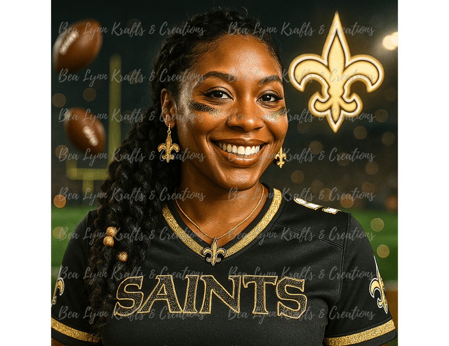 Celebrate the fierce pride of the Who Dat Nation with this high-resolution transparent PNG featuring a stunning female New Orleans Saints fan! From the shimmering gold makeup to the fleur-de-lis earrings and beaded braid accents, this fan radiates team spirit and New Orleans flair. Perfect for your next football-themed creation, this image delivers authentic energy and style in every pixel.