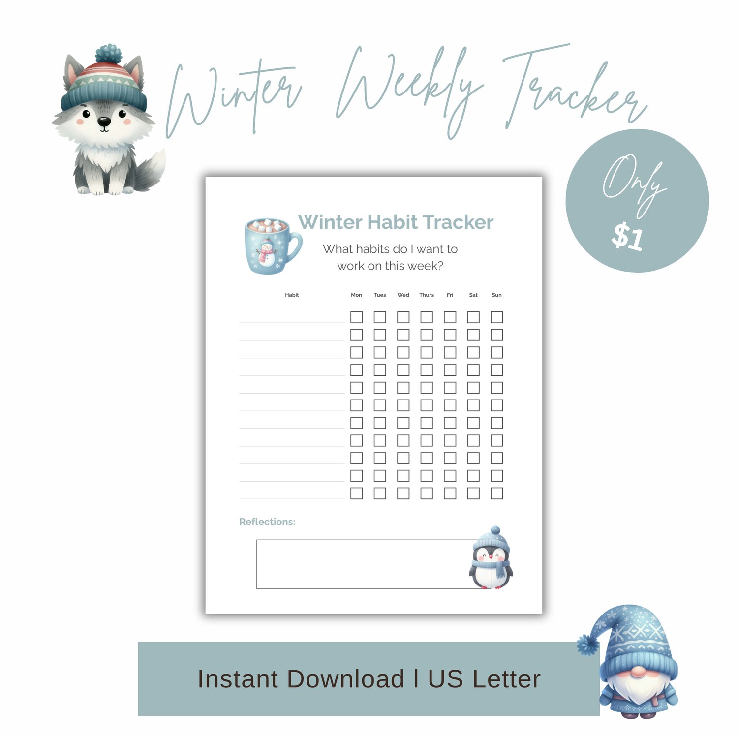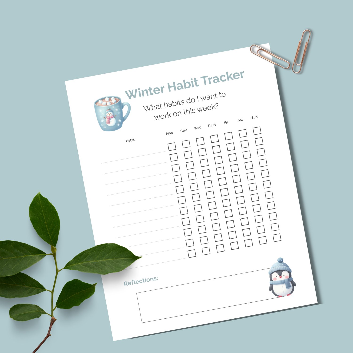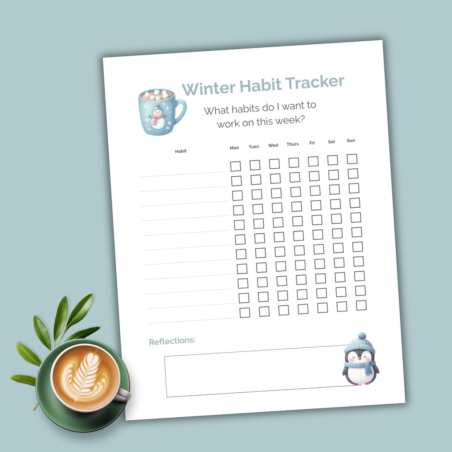 Stay motivated with this Winter Weekly Habit Tracker, featuring a beautiful watercolor penguin and cozy mug of hot chocolate. Track your goals, check off your progress, and use the reflections section to celebrate your wins!