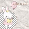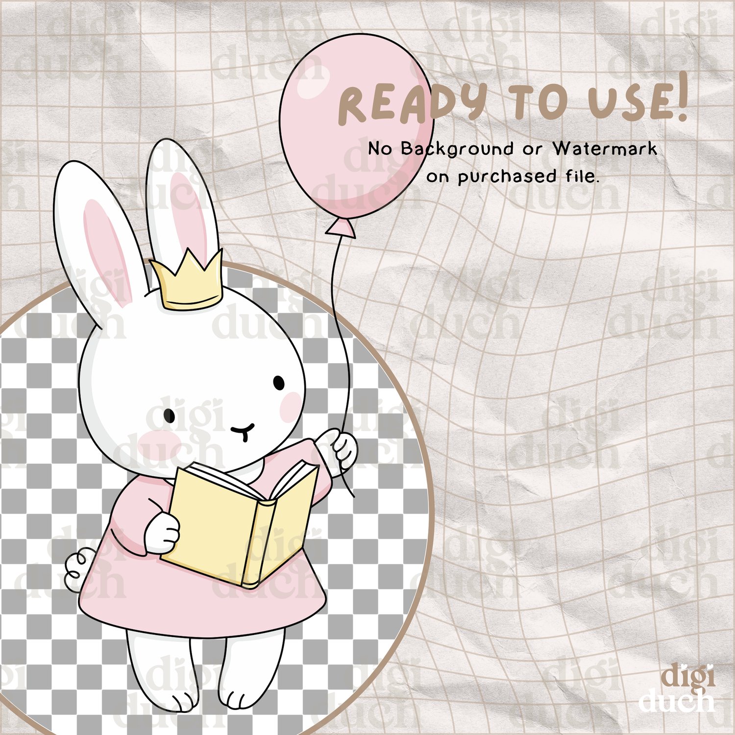 Cute Bunnie PNG, SVG, Bookish Bunny Clipart, Pink Rabbit with Balloon, Kawaii Animal Art, Digital Download, Commercial Use