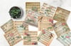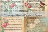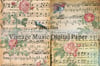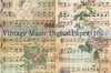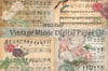 This is a texture pack of 16 digital papers in JPEG format with old paper textures, antique floral illustrations, and vintage sheet music.