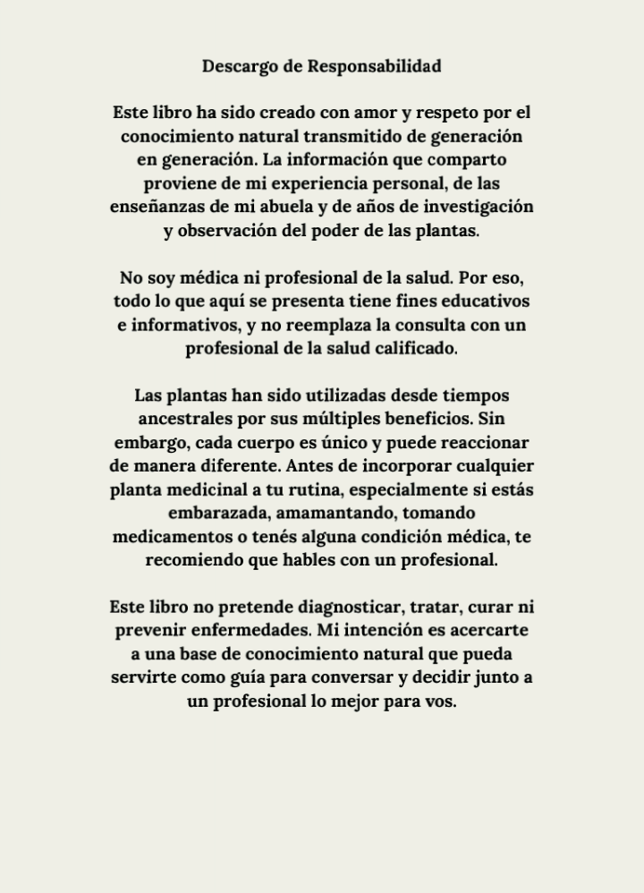 No soy médica ni experta, solo una mujer que aprendió a observar, preguntar y cuidar. Este material está hecho para informar, inspirar y acompañar, no para reemplazar el consejo profesional. Siempre es fundamental consultar con un médico o especialista antes de usar cualquier planta con fines terapéuticos.