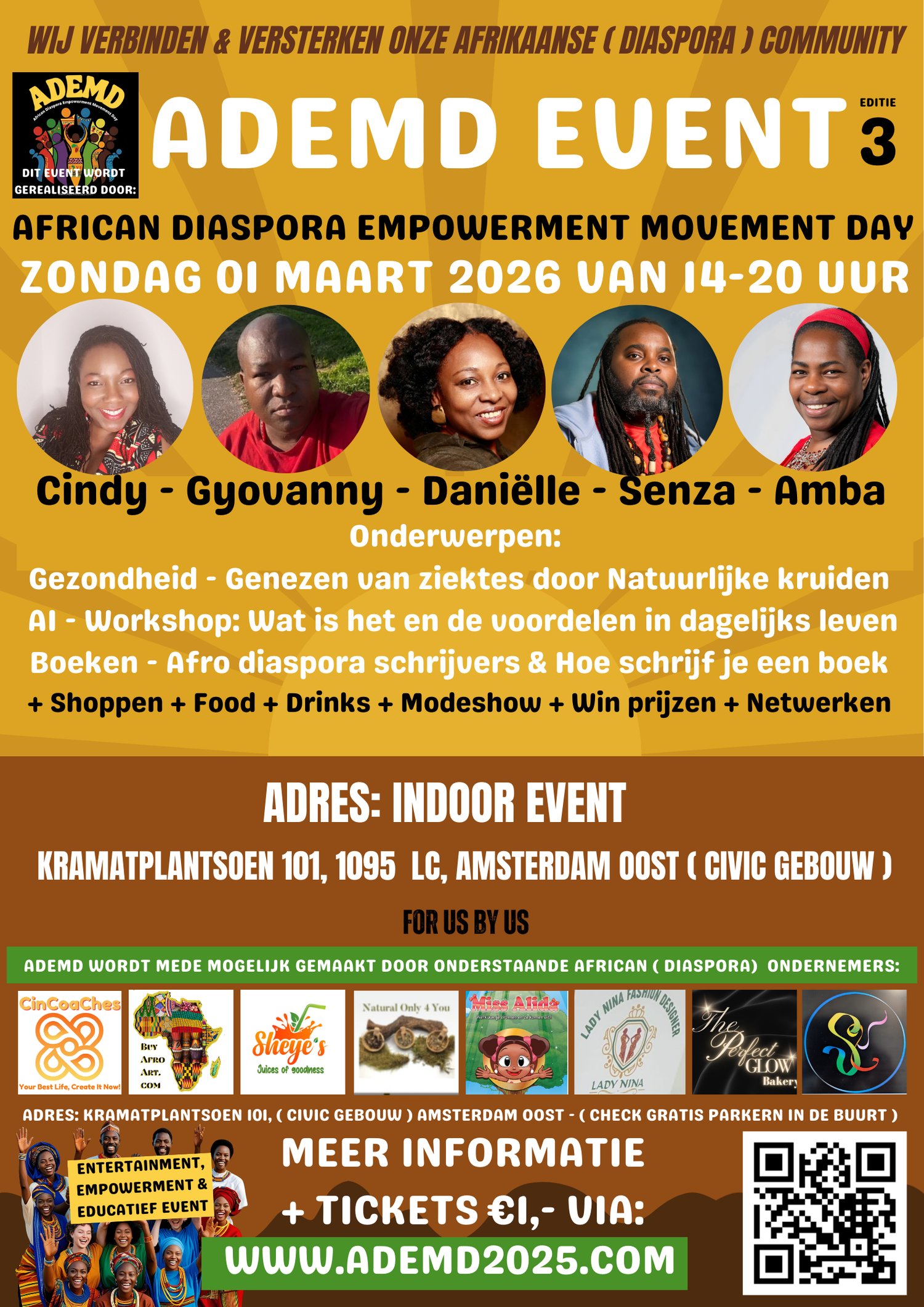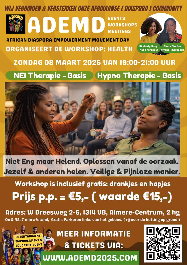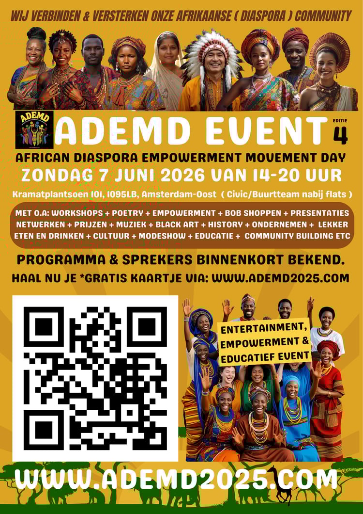 ADEMD staat voor: African Diaspora Empowerment Movement Day. Een event met entertainment, empowerment en educatie om de Afrikaanse cultuur te omarmen. Bekijk het programma op onze site: WWW.ADEMD2025.COM - ( kost €3,50 per persoon )