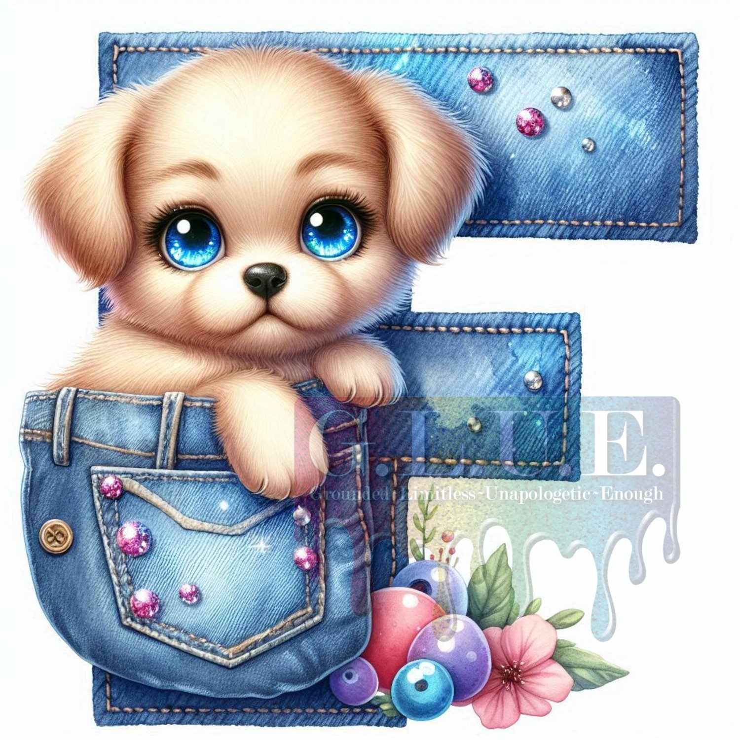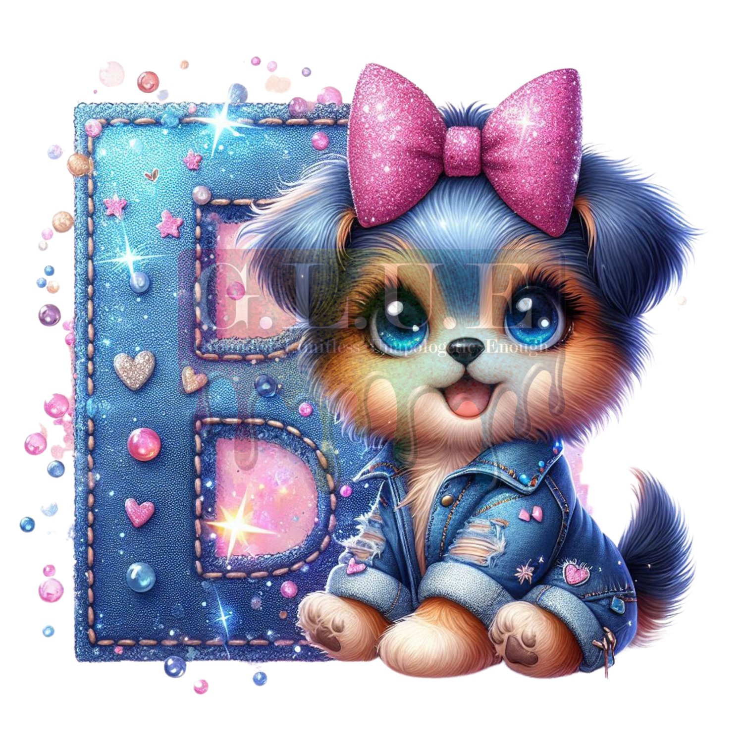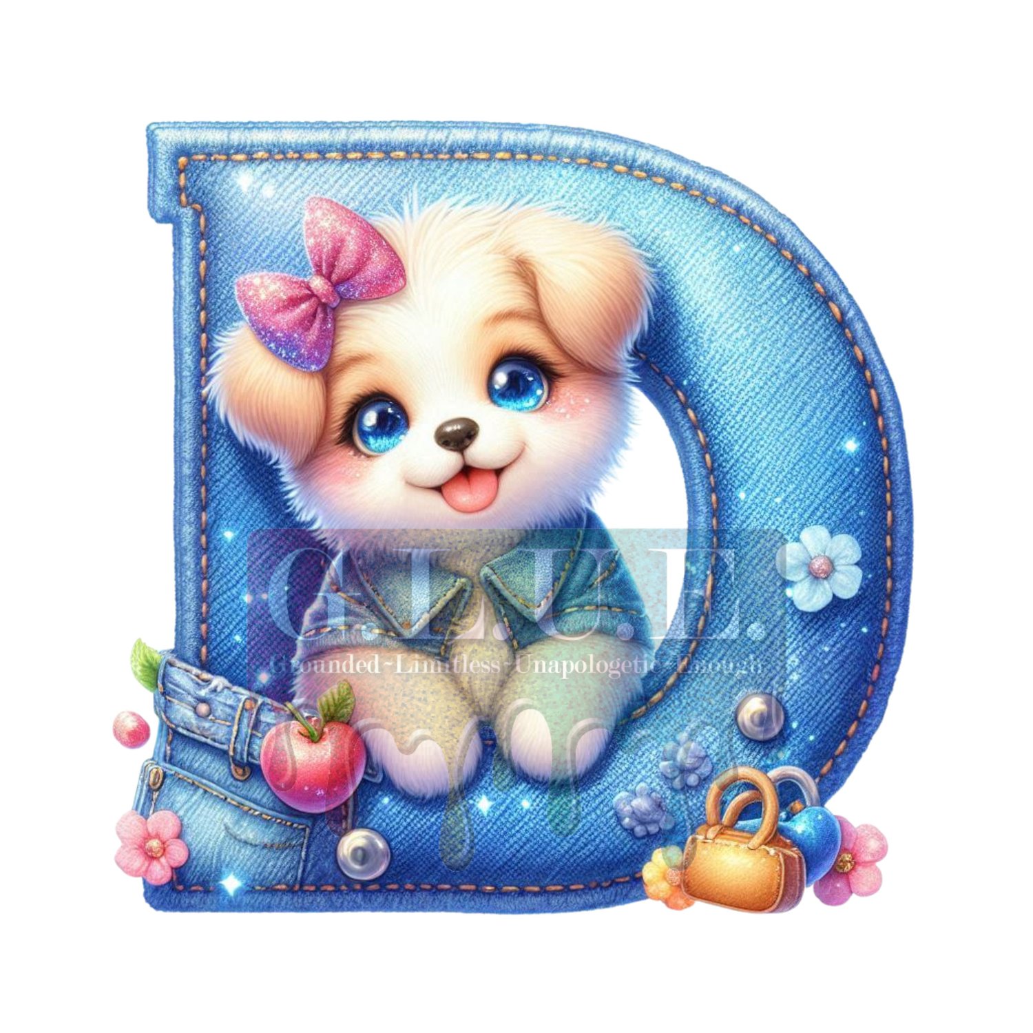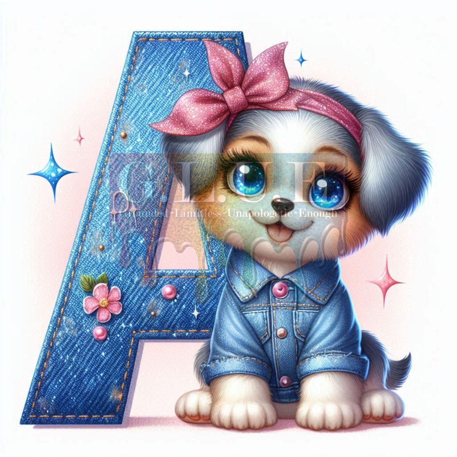 Unleash the cuteness! This Deniim Puppy Alphabet Collection (A-Z) is packed with sweet denim-loving pups, sparkling bows, and charming details that scream "adorable with attitude!" Perfect for custom name designs, baby merch, birthday tees, classroom décor, or personalized gifts. Each letter features a unique pup dressed in glam denim and glitter, making your projects POP with personality and paw-sitive vibes.