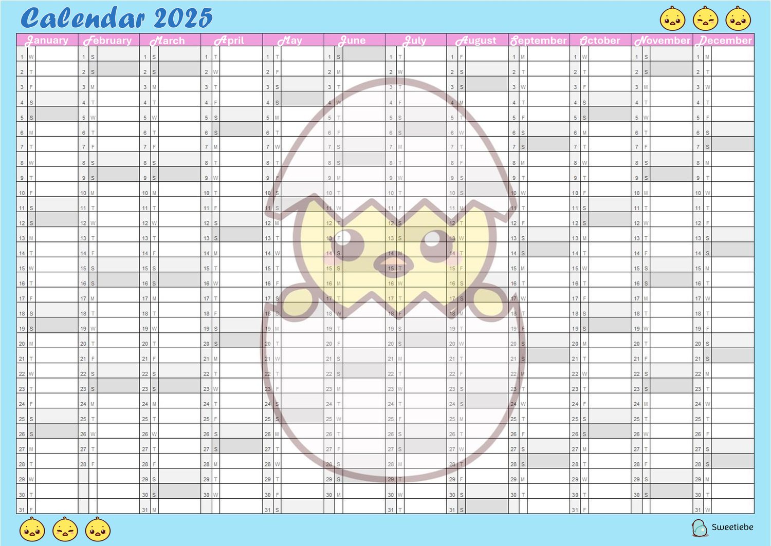 Quack your way through 2025 with this sweet duckling-themed calendar planner! Featuring a delightful little duck hatching from its egg, this single-page design is available as a versatile PDF file for digital use or printing. Whether you use it to organize your year on your devices or display it on your wall, this calendar will bring a smile to your face with its charming design. Perfect for duck enthusiasts, animal lovers, or as a thoughtful gift!