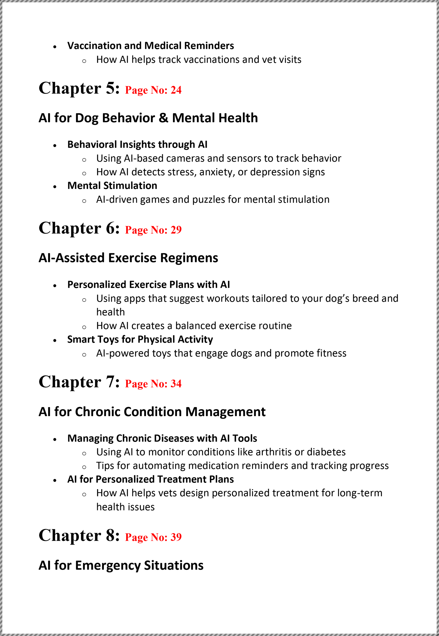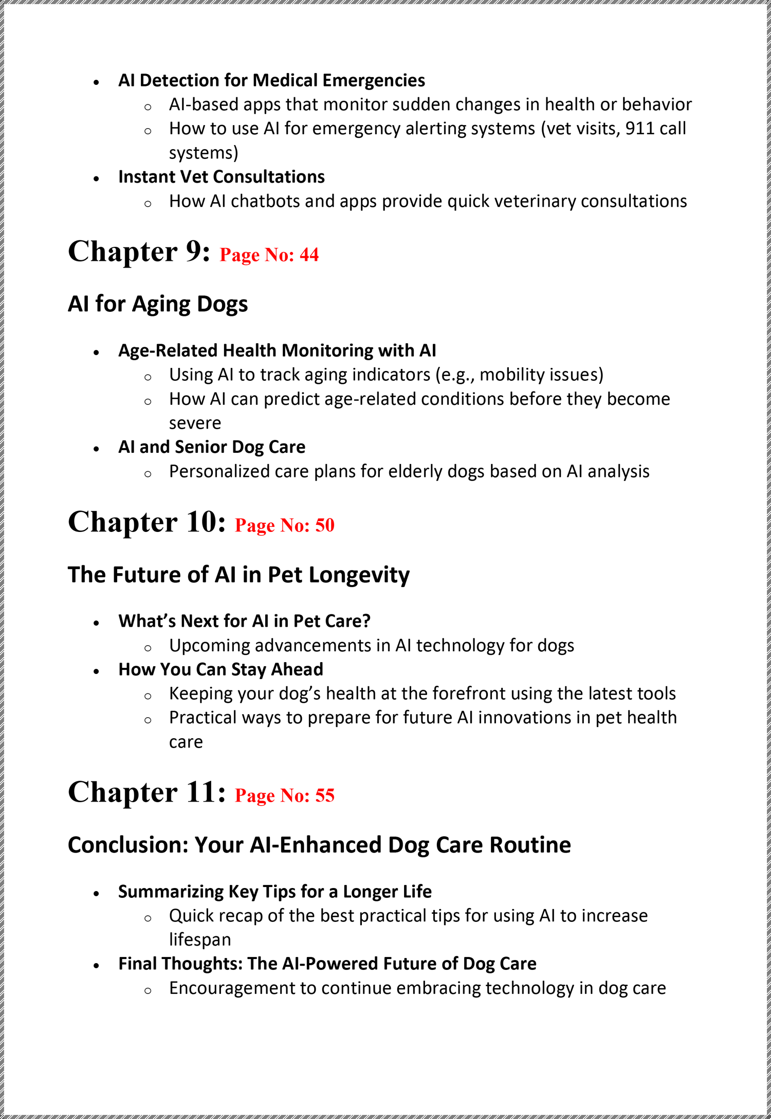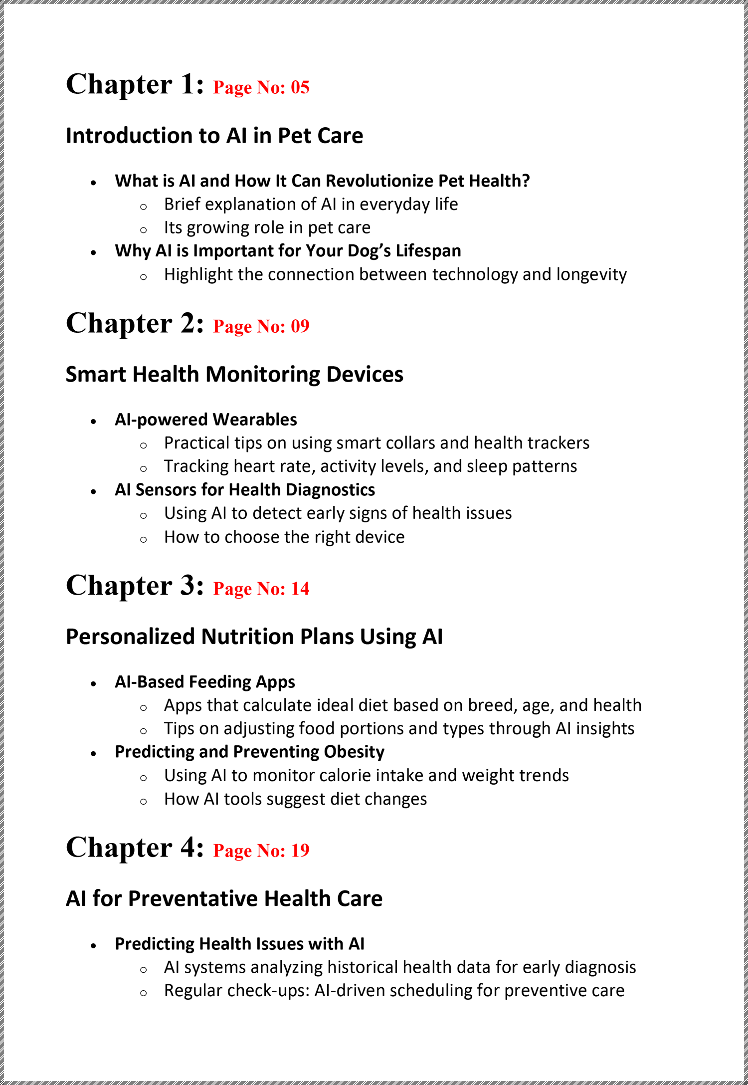 This eBook offers 11 detailed chapters and 57 pages of practical, step-by-step advice, all designed to help you use AI to increase your dog’s lifespan and improve their overall health.
