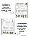 - Cada planilla de escritura tiene cinco opciones de animales a elegir. Los estudiantes podrán elegir uno de los cinco animales, recortarlo y pegarlo en el cuadro de su hoja de escritura antes de comenzar su historia.