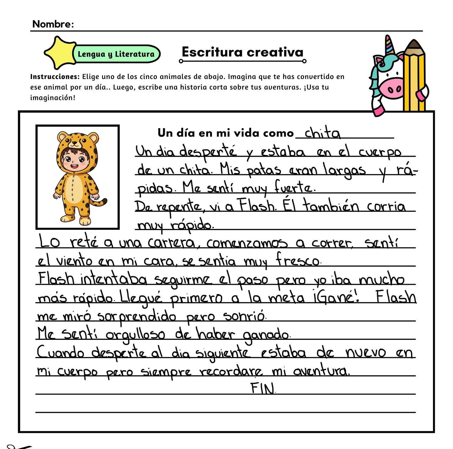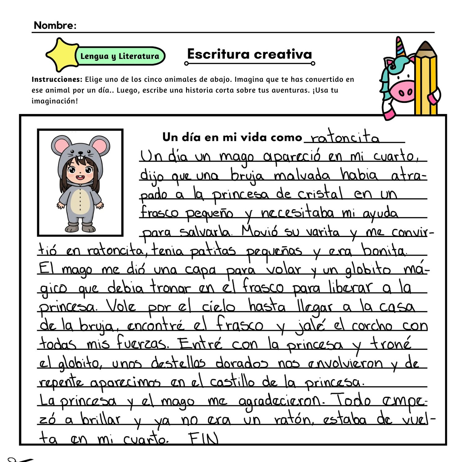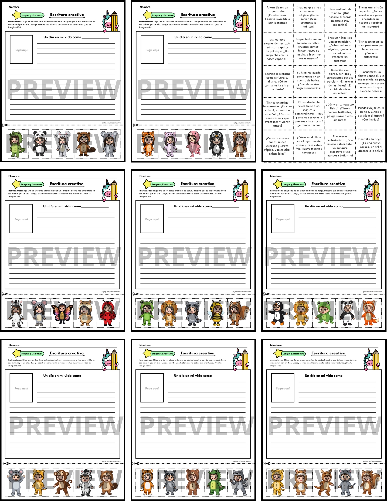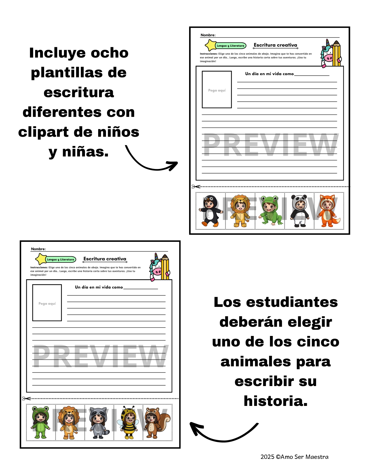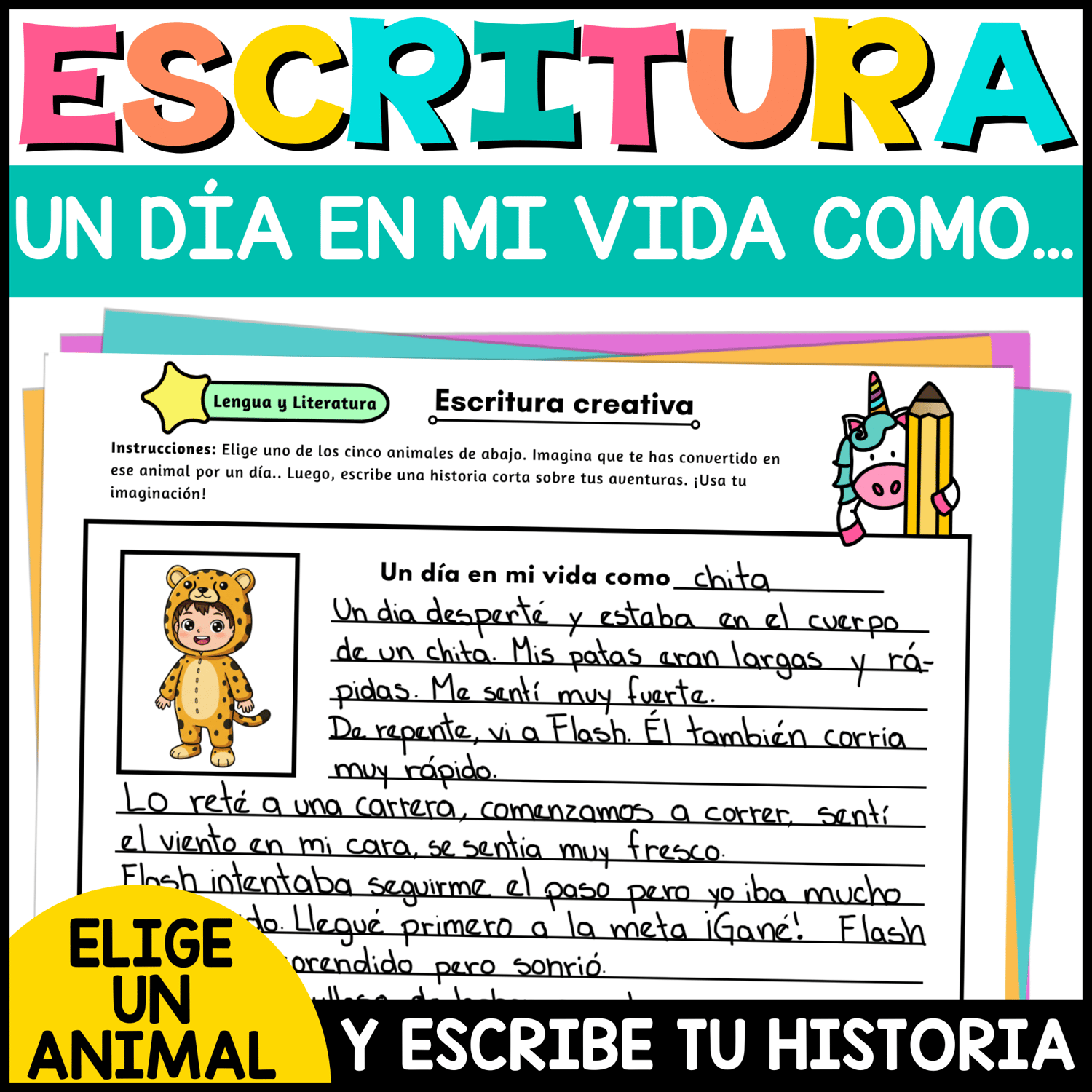Este recurso invita a los niños a imaginar cómo sería su vida si se convirtieran en un animal por un día. Con opciones para elegir, escribirán una historia titulada "Un día en mi vida como ________", (ratón, panda, león etc) desarrollando su imaginación y habilidades narrativas.