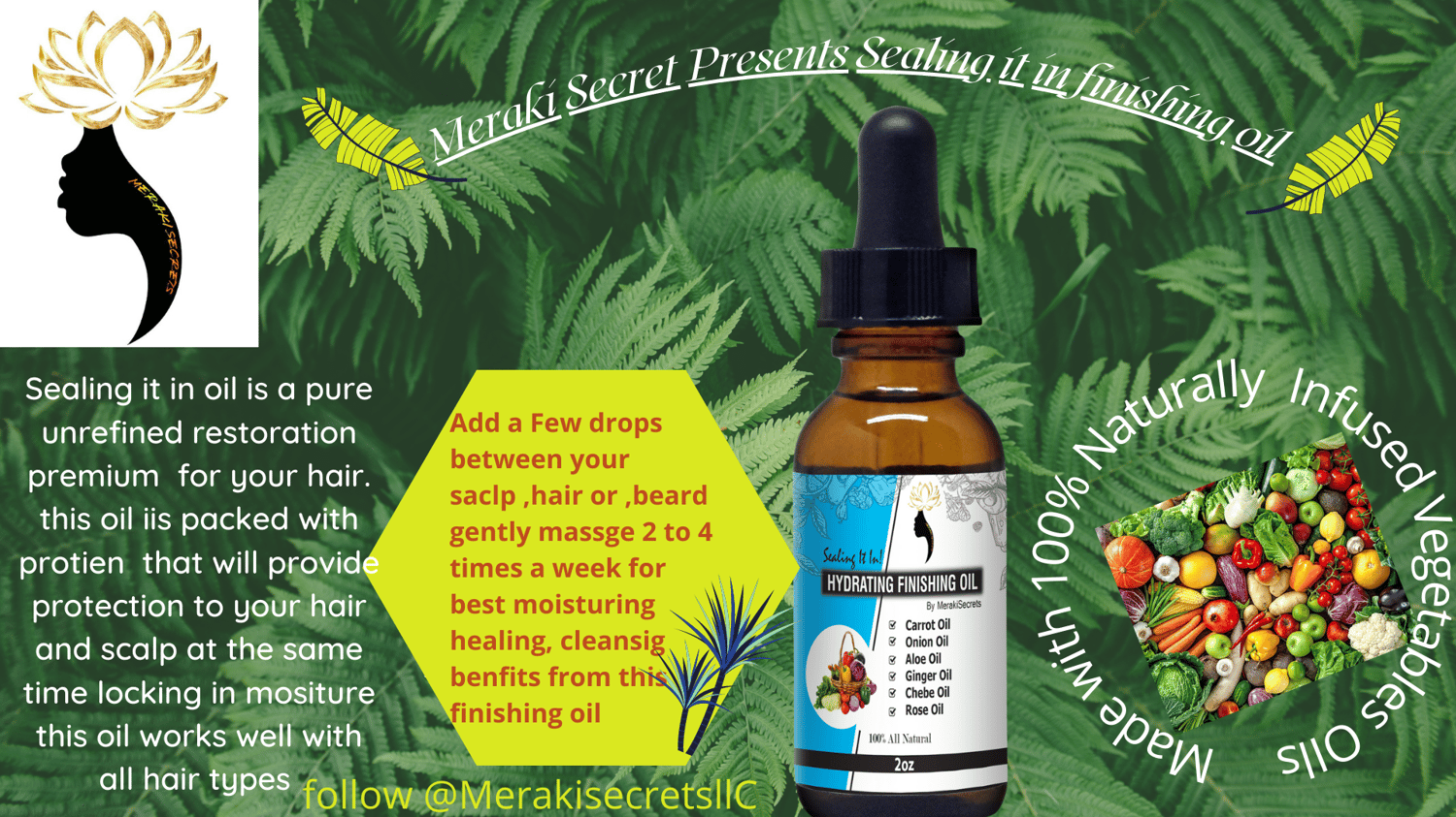 Sealing it in Finishing Hair oil is made of 100% natural oils and herbs that work together to stimulate the scalp and promote hair growth. THIS PRODUCT REALLY WORKS. It can also be used to soften course hair, detangle hair, for deep conditioning and hot oil treatments. This essential hair oil does not have any chemicals and no side effects. and will thicken your Hair