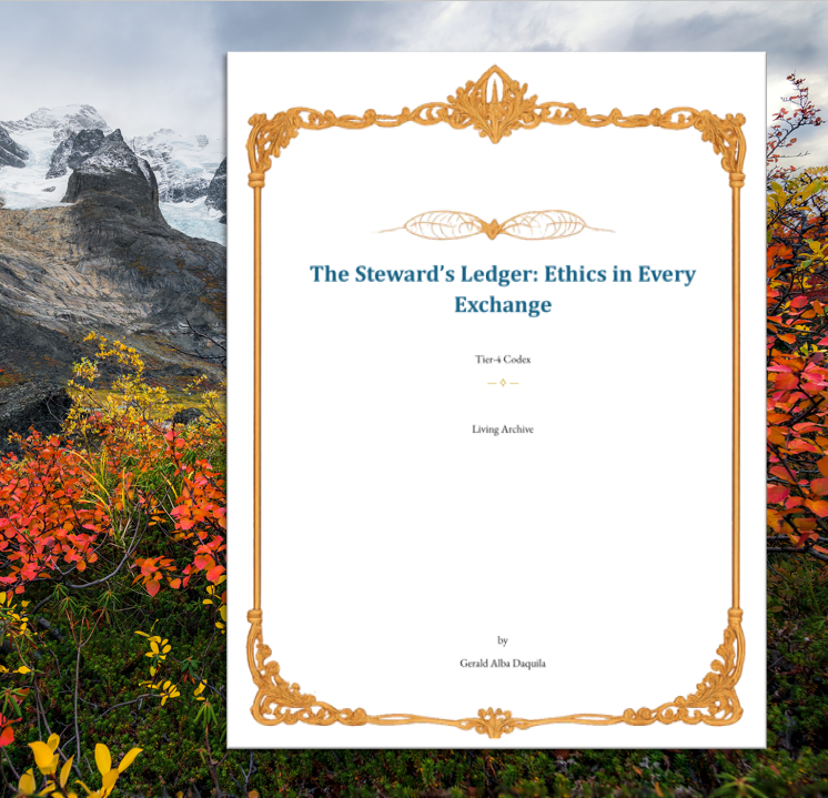 The T4 Codex, The Steward's Ledger, outlines the ethical framework for exchanges, emphasizing resonance and integrity. It establishes stewardship as a key principle, where truth, transparency, reciprocity, and overflow guide interactions. The Codex serves as a living ledger ensuring that all exchanges honor ethical standards, nurturing planetary harmony and collective abundance.
