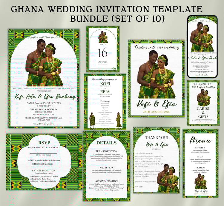 This template features bold Kente patterns, elegant fonts, and a clean design that honors Ghanaian heritage while offering a modern touch for your special day. Whether you're sending a printed invite or a mobile-friendly digital invitation, this template has you covered!