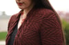 The pattern photos show the 40” size, worn on a 38” full bust (worn with 2” of positive ease). The sizing is based off of the back measurement, as the cardigan has open fronts which can overlap slightly (with the large cables overlapping) if pinned closed. The open fronts allow an easy fit in the body with some flexibility in sizing. To achieve a similar look, choose a size that is the same size as your full bust measurement or up to 4” bigger. If you plan on wearing lots of layers or thicker (DK weight or heavier) sweaters underneath this cardigan, you could size up one size from the typical recommendation for your measurements.