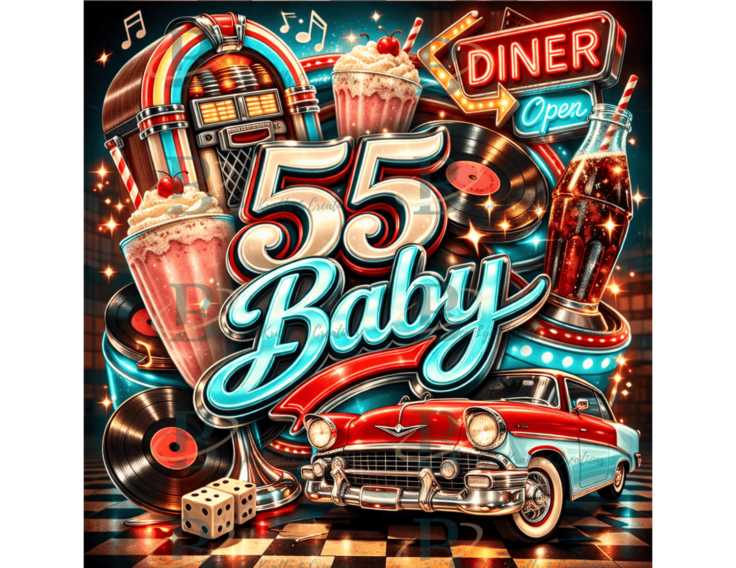 Celebrate the spirit of the 1950s with this bold “55 Baby” retro diner design! Inspired by the golden age of rock & roll, the artwork features vintage chrome lettering surrounded by classic 50s nostalgia like jukeboxes, vinyl records, milkshakes, soda bottles, neon diner signs, and classic cars. The bright turquoise, cherry red, and chrome accents capture the fun energy of 1950s American diner culture.