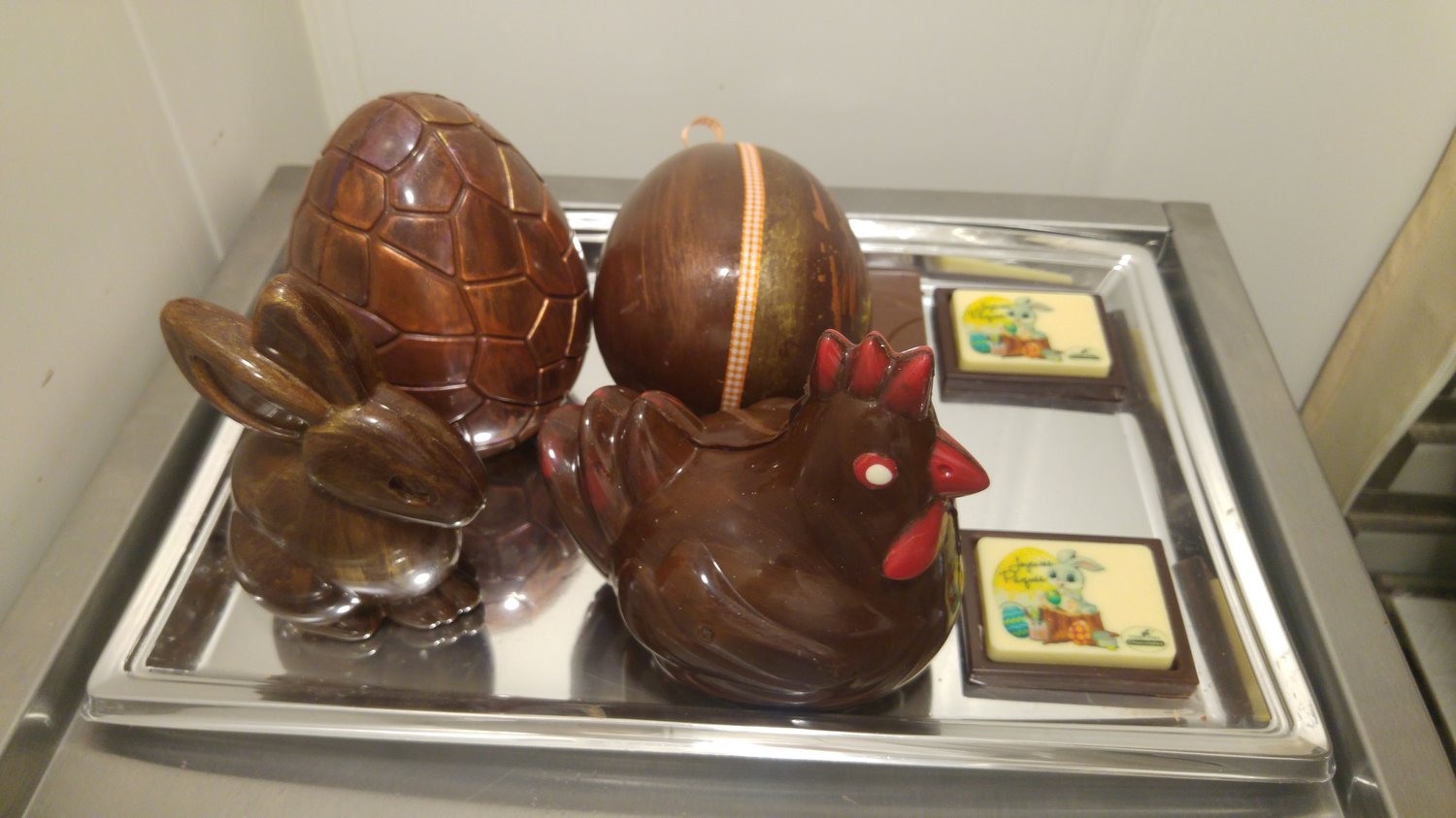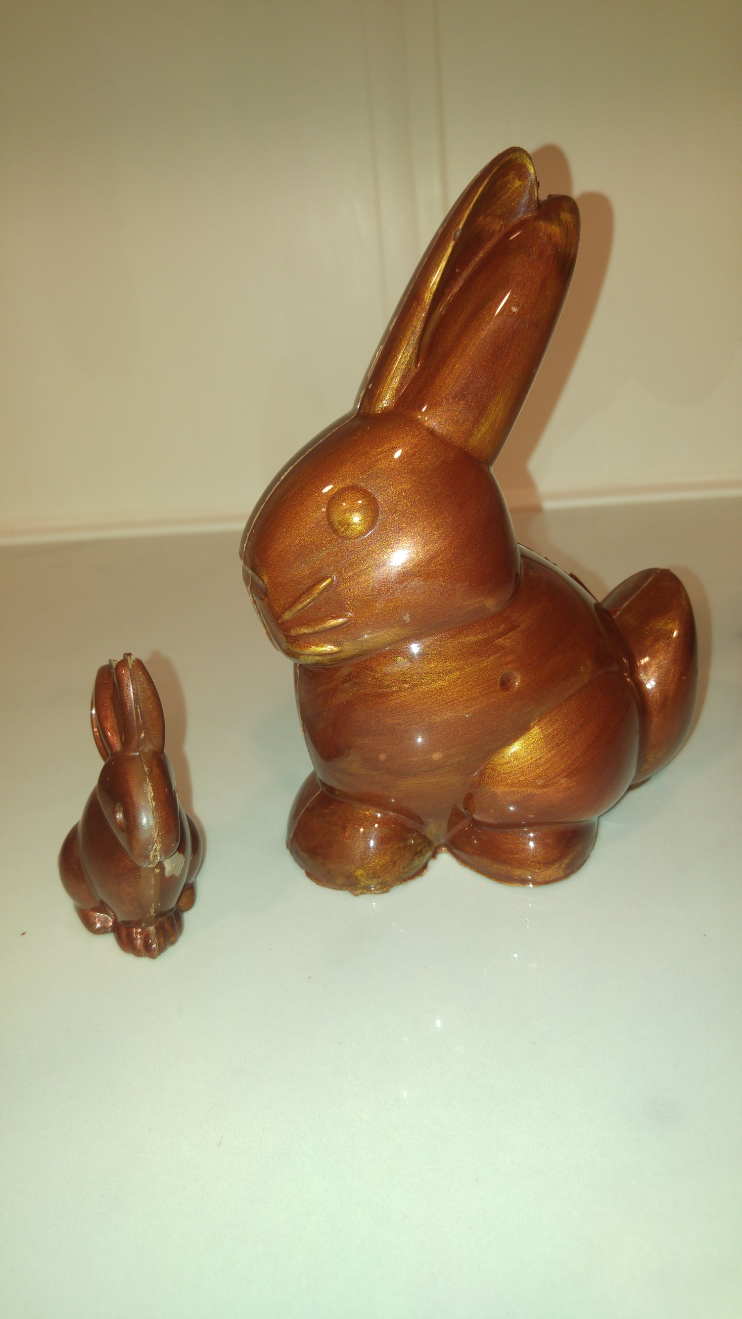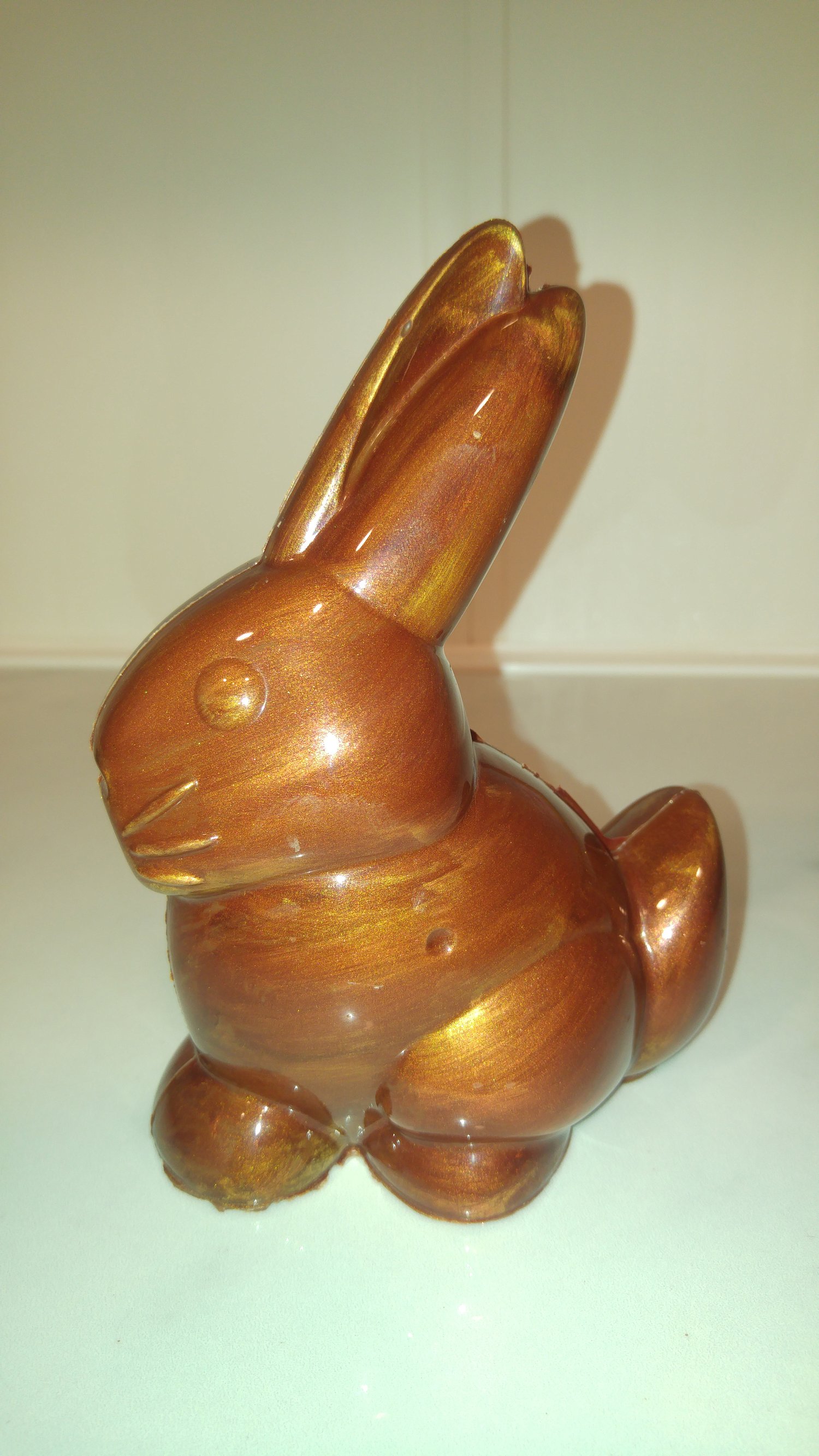 Le lapin doré et cuivré, moulage artisanal . Chocolat au lait minimum 38% Pur beurre de cacao.