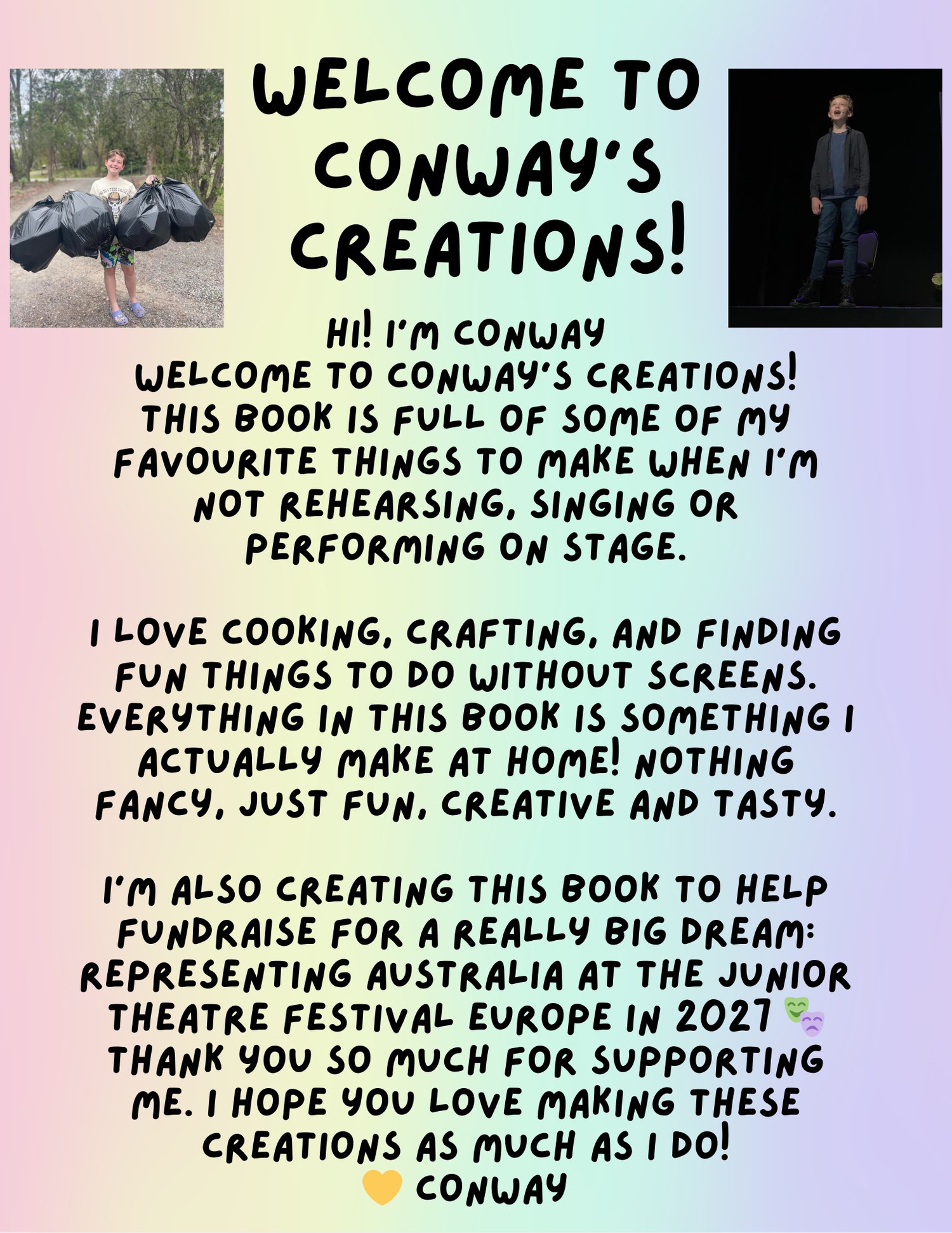 I created this 52 page book as part of my fundraising to represent Australia at the Junior Theatre Festival Europe in 2027. I need to raise $15,000 to get there, and I really want to earn as much of that as I can myself.