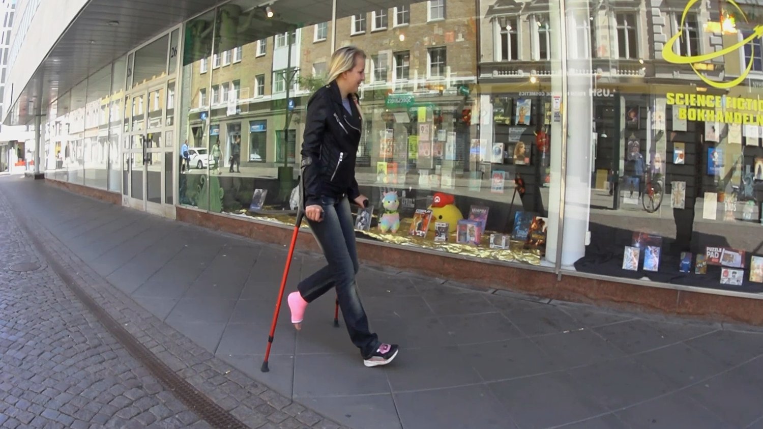 On her way to the city's shopping street, we meet Alva who, with the help of her red crutches, crutch forward with her left leg in the air.The color of the cast is pink, which of course is Alva's favorite color.Alva stands outside a shop window and finds an old comic book she once followed and explains to the photographer what it's about before she crutch on to the restaurant they are going to have lunch at.