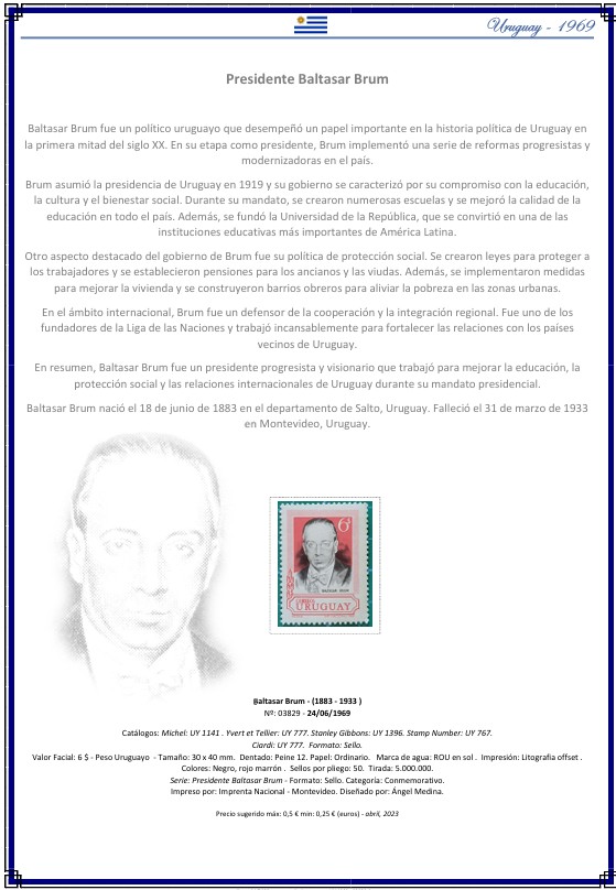 Ficha filatélica en formato PDF dedicada a la emisión de Uruguay de 1969 en homenaje a Baltasar Brum.