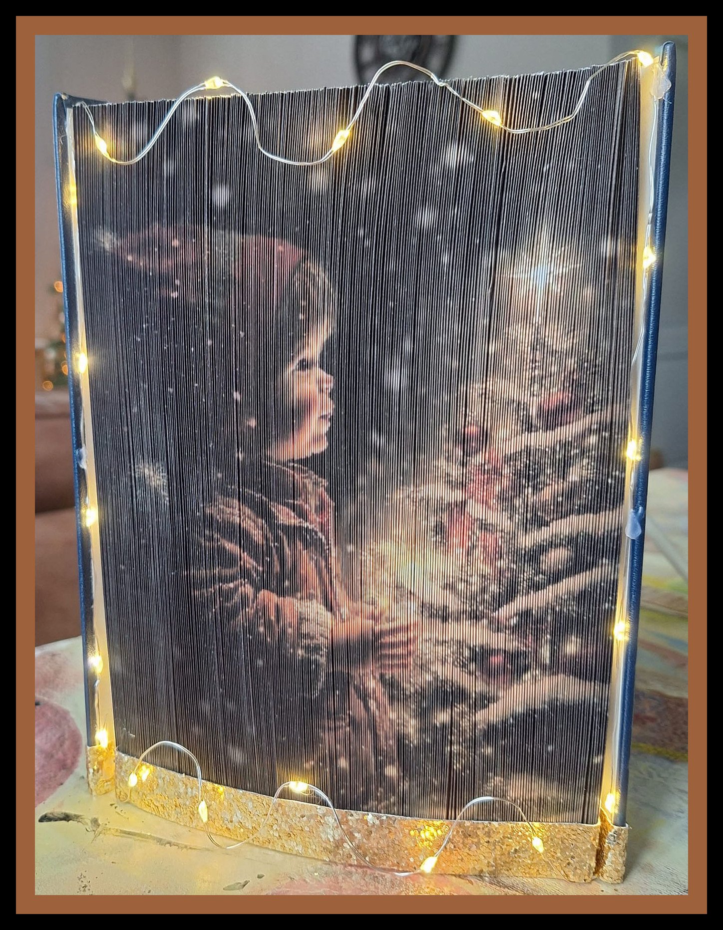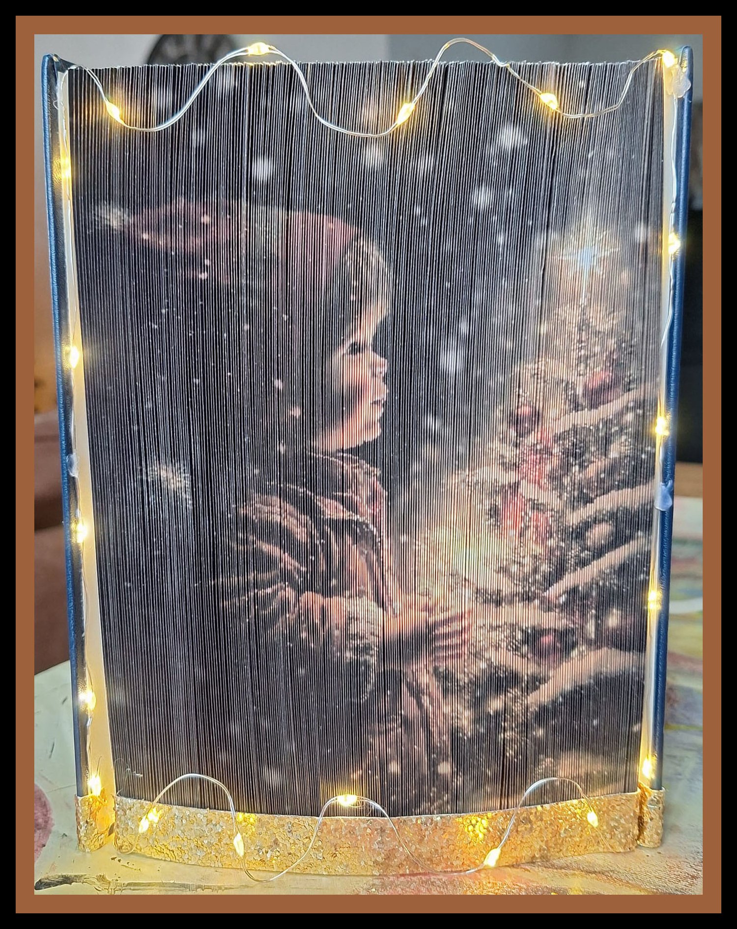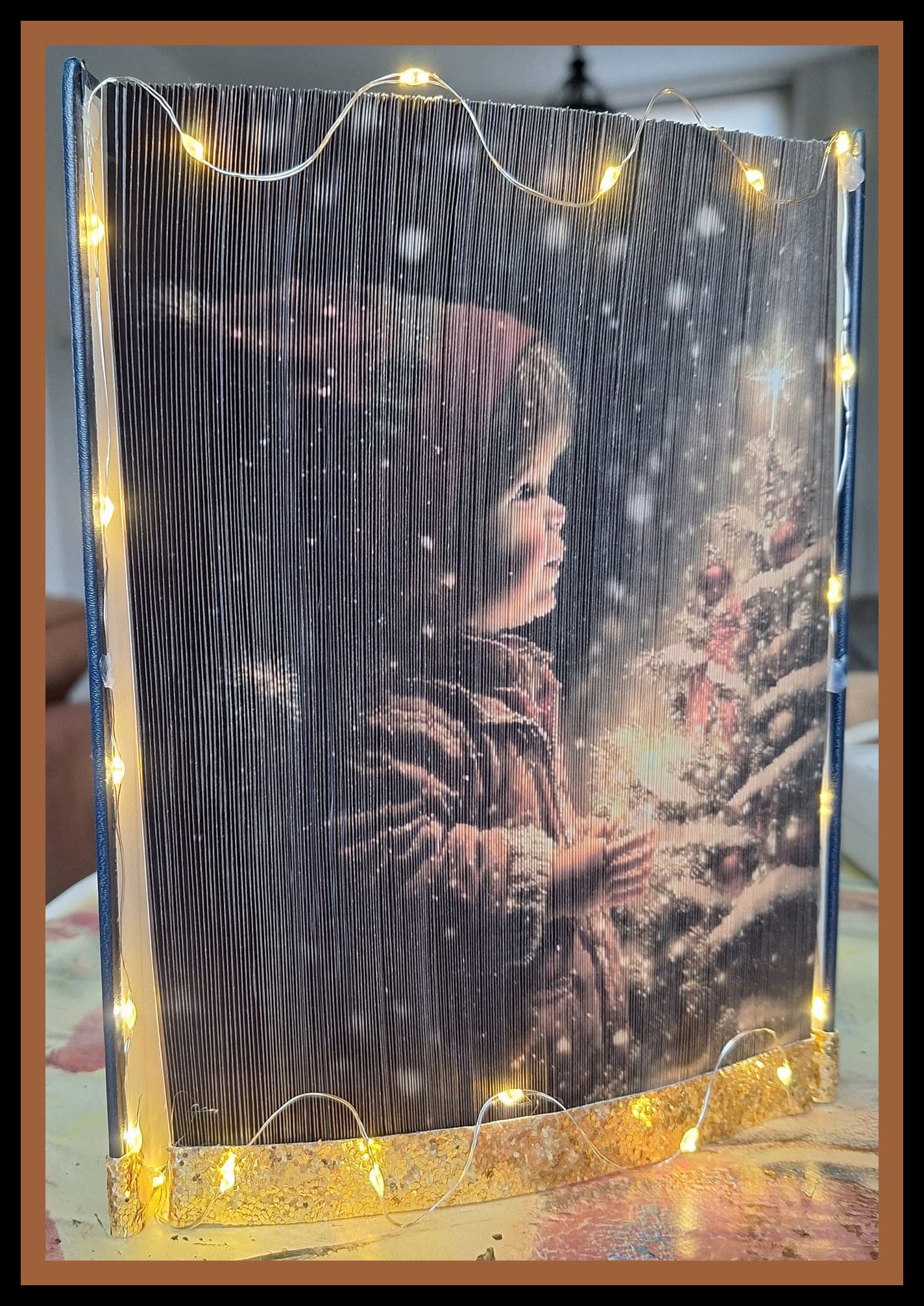 The gentle glow of the candle illuminates the child’s face, creating a sense of calm reflection and nostalgic charm. Snow-dusted branches and subtle winter details add depth and texture, making the finished piece feel almost like a classic seasonal illustration brought to life through book folding artistry.