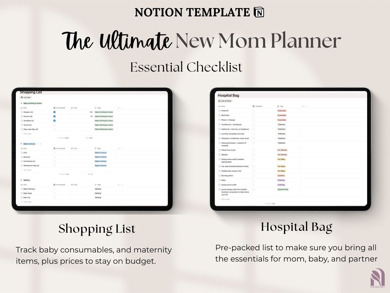 🍼 Essential Checklist – Categorized shopping list + hospital bag essentials