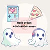 This hand-drawn PNG bundle blends gaming controllers, cute ghost characters, pizza, pixel hearts, and cozy accents into one versatile set that works for Valentine projects, gamer merch, spooky-cute designs, and everyday creative use.