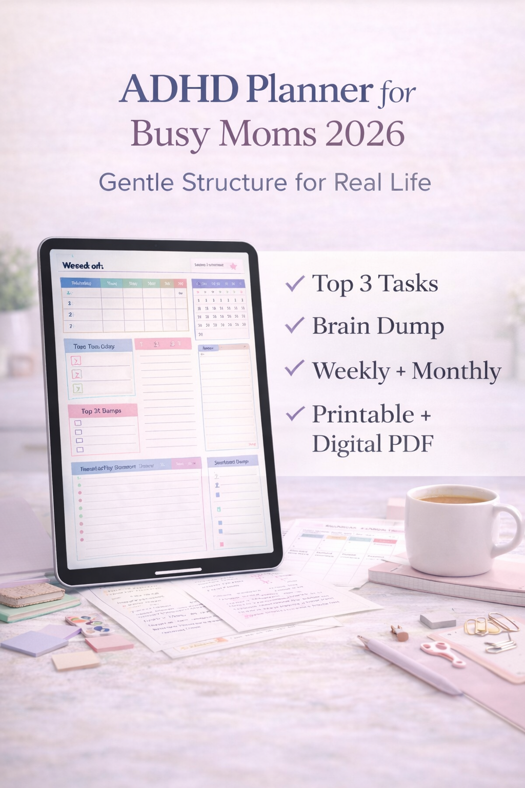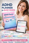 The ADHD Planner for Busy Moms 2026 is a printable and digital PDF created for moms who want more structure, less overwhelm, and a planning system that actually feels supportive.