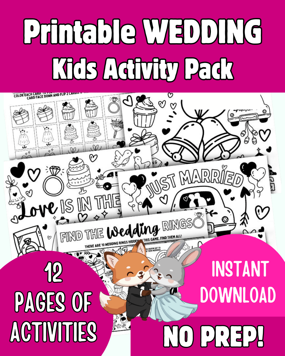Included in this printable wedding activity book for kids are: