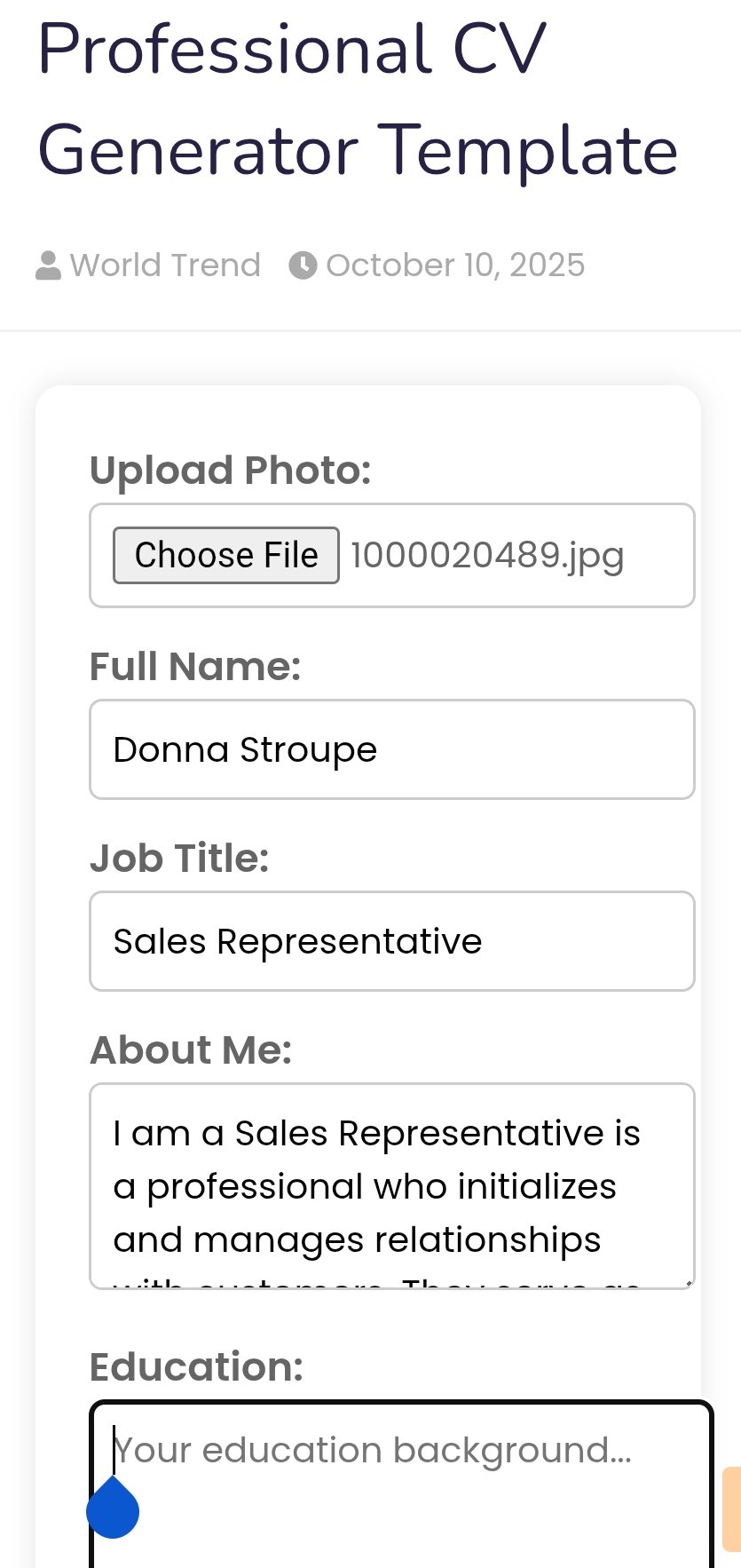 Create stunning resumes instantly with this modern CV generator — includes live preview, photo upload, and A4 PDF export.