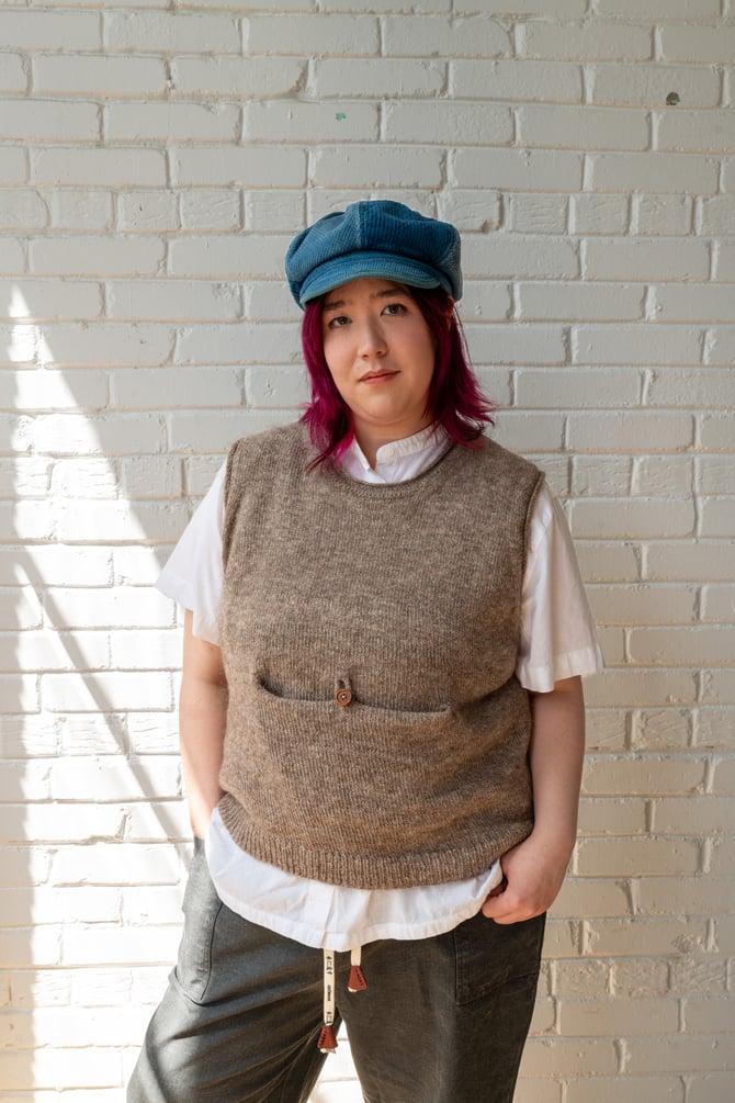Benri is a unisex pullover vest worked from the top down, and features a large pocket on the front. The neckband and armholes are finished with double-knit for added structure.