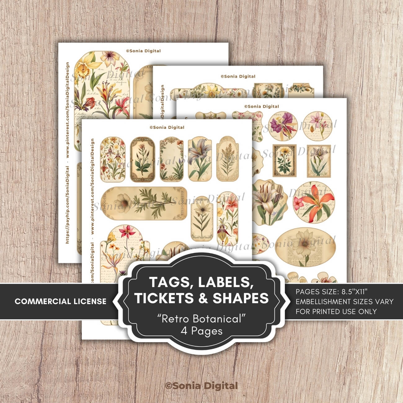 🔸4 printable pages: Tags-Labels-Tickets-Shapes, “Retro Botanical” Collection, in Letter size 8.5”x11”. All pages are sold Watermark-free. Embellishment sizes vary. Commercial use license included*.
