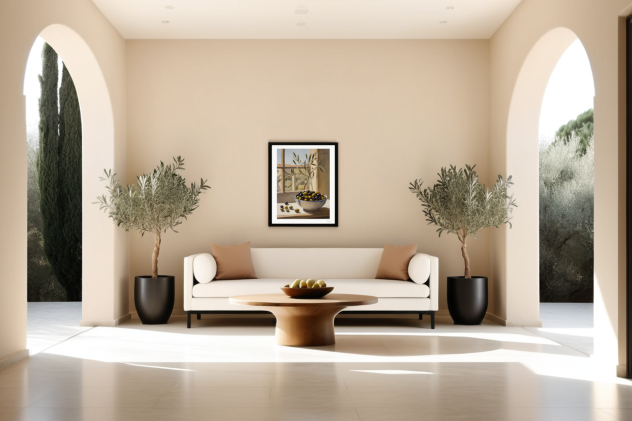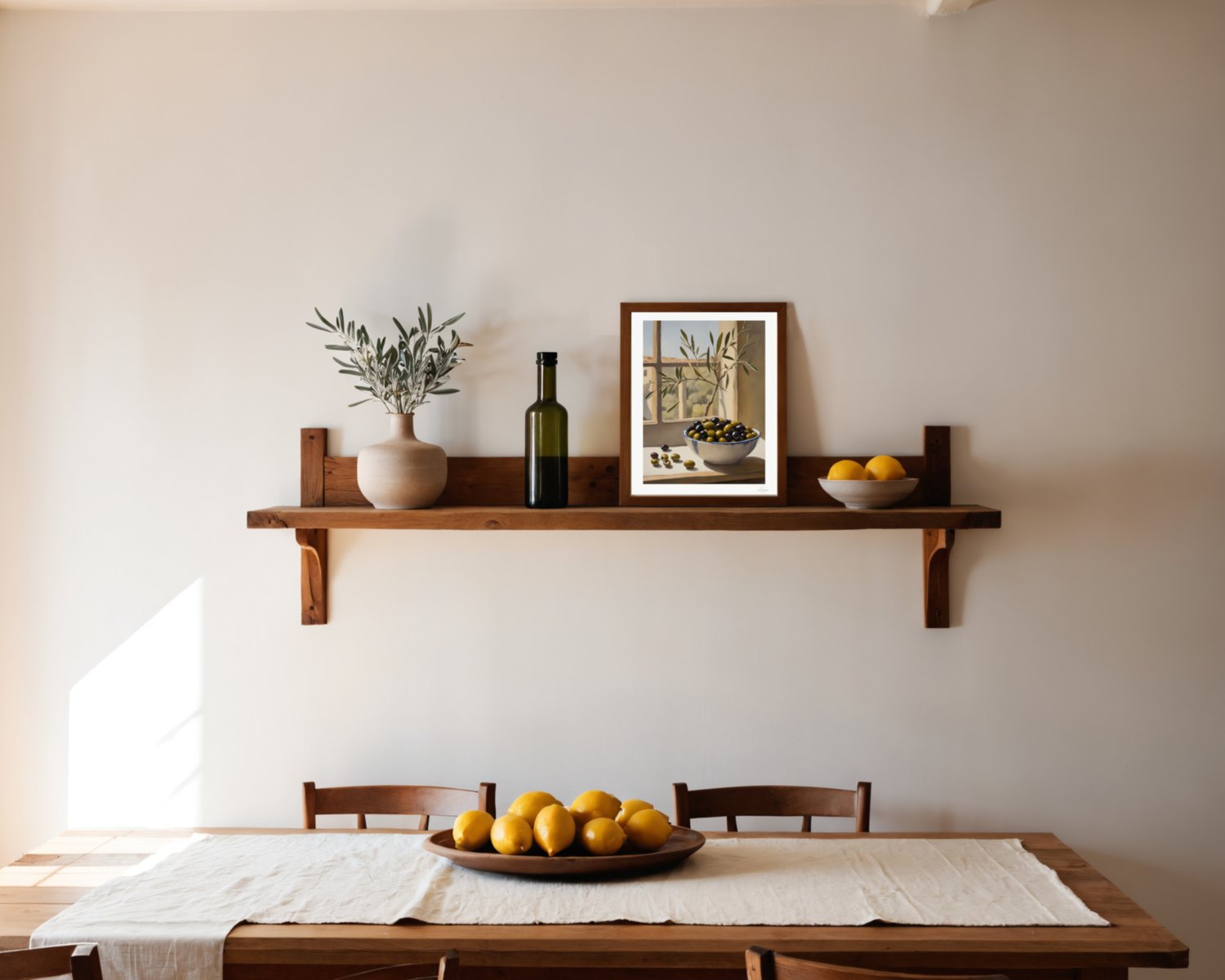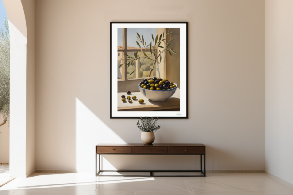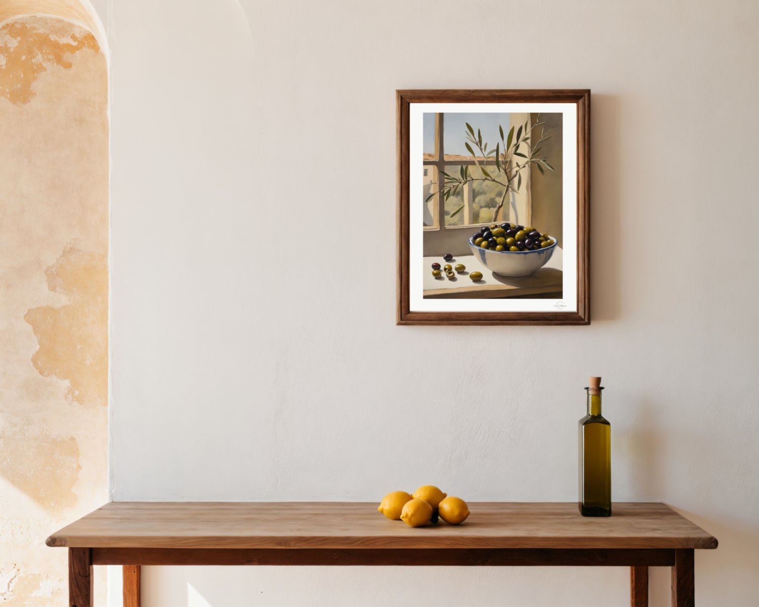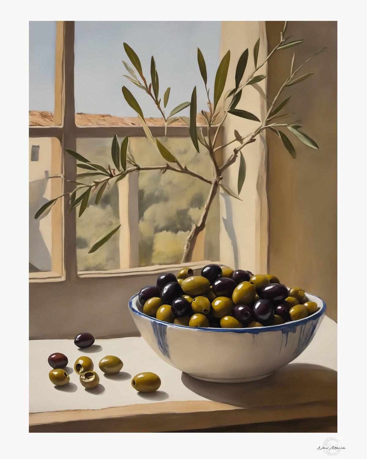 A quiet still life of olives resting by a sunlit window. Soft light, natural tones, and a simple composition create a calm and timeless atmosphere.
