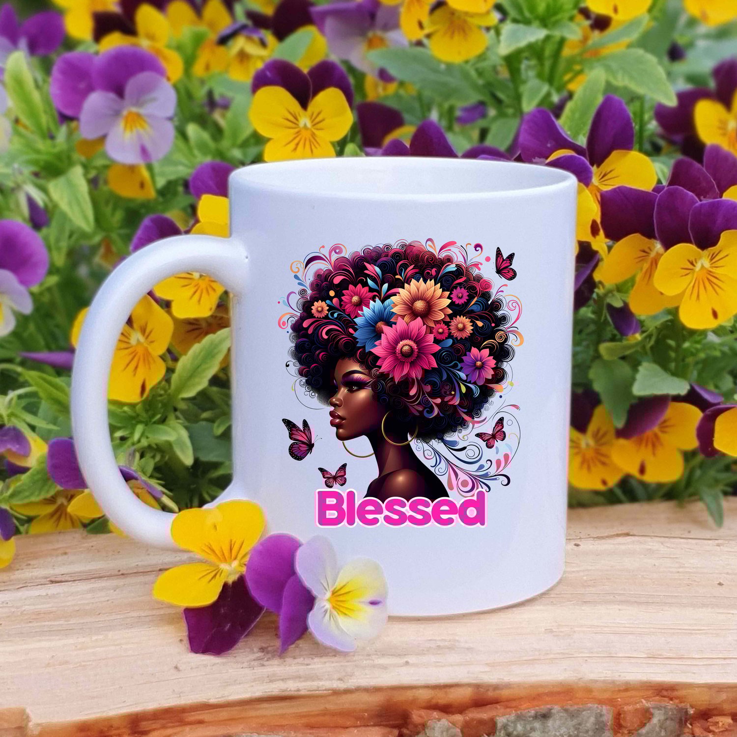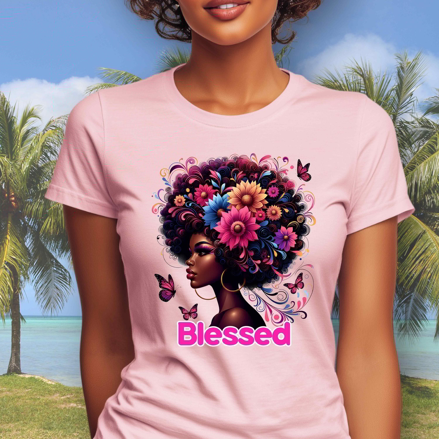 Add beauty, inspiration, and vibrant energy to your projects with this stunning digital PNG design! Featuring an elegant woman with natural hair adorned in bold florals, surrounded by butterflies, and highlighted with the uplifting word “Blessed”, this artwork is perfect for creating statement pieces that inspire.