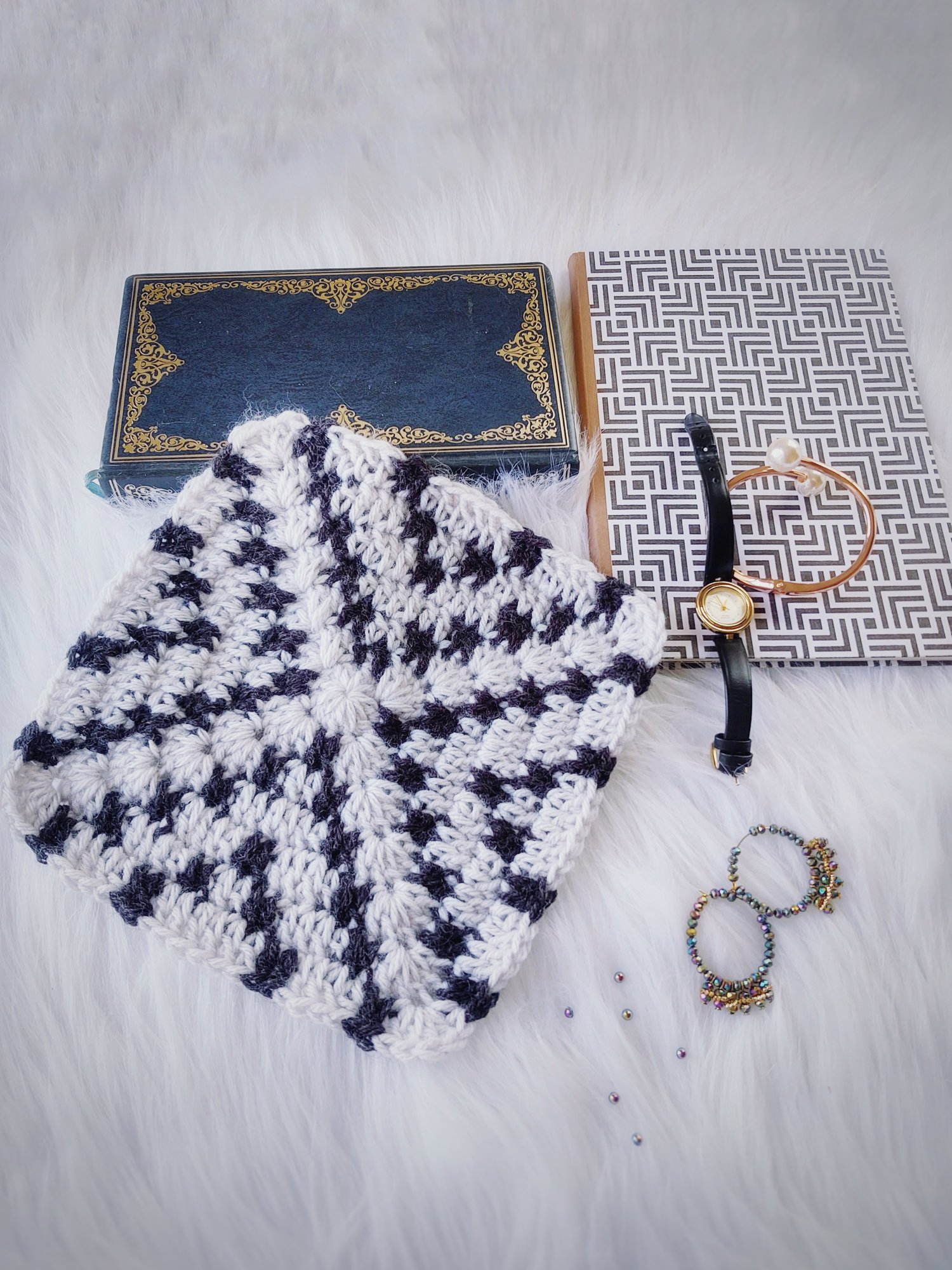 A solid granny square made with striking contrast , shows off a diamond pattern when the motifs are joined. This square will be perfect to learn color work in the round by carrying the unused yarn along.