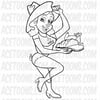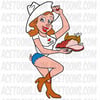 Royalty free clip art illustration of a cartoon sexy pig cowgirl with bbq brisket and roasted chicken on a tray.