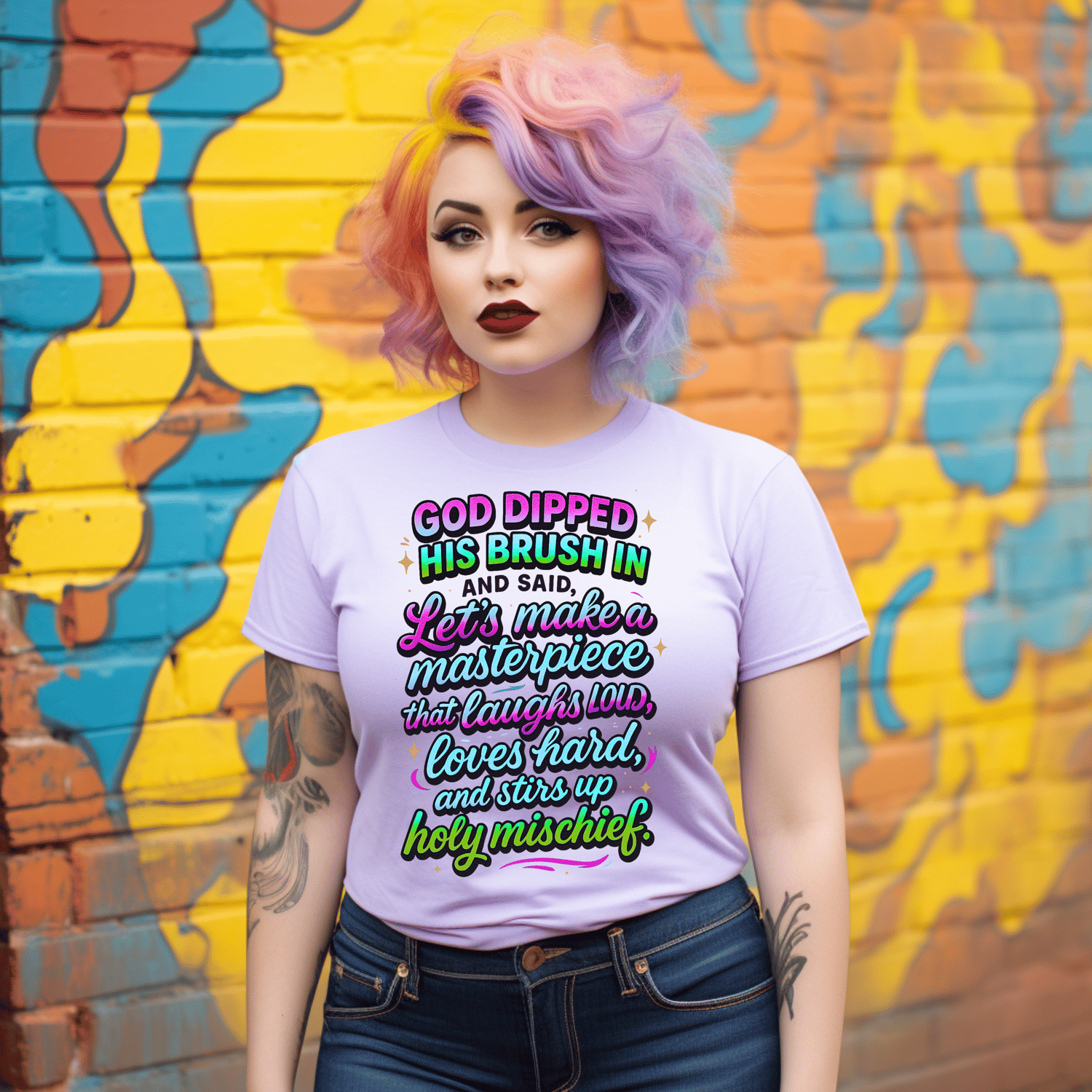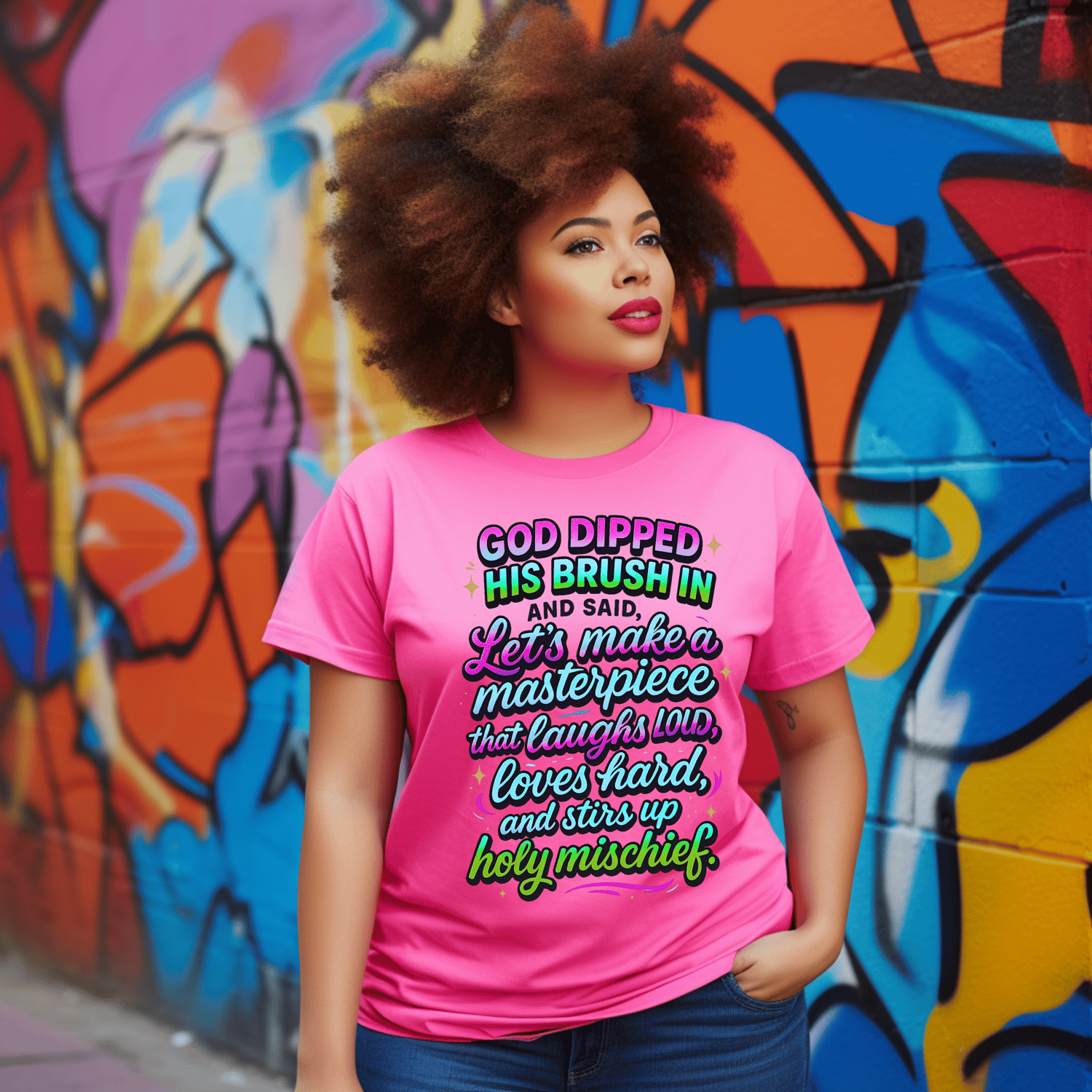 Let your faith shine with personality and joy! This bold and colorful “God Dipped His Brush In Holy Mischief” digital PNG design is perfect for tumblers, T-shirts, journals, stickers, wall art, and more. Designed for spiritual baddies who love to laugh loud, love hard, and stir up a little holy fun. 🎨✨