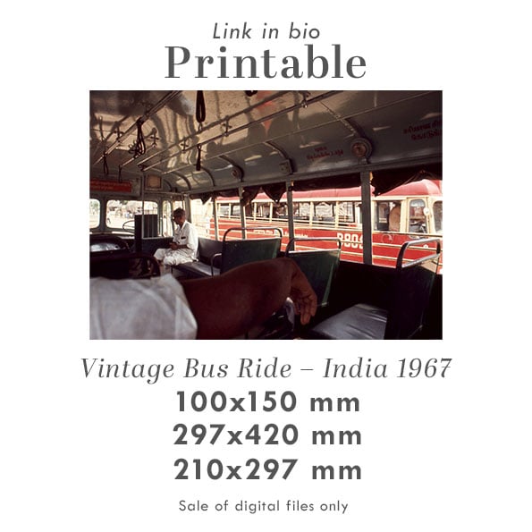 Captured in 1967, this rare color photograph offers a quiet glimpse inside a public bus in India, with its vintage charm and unique atmosphere. The interior, the muted light, the handwritten Tamil signs, and the red buses outside evoke a timeless journey through everyday life in South India.