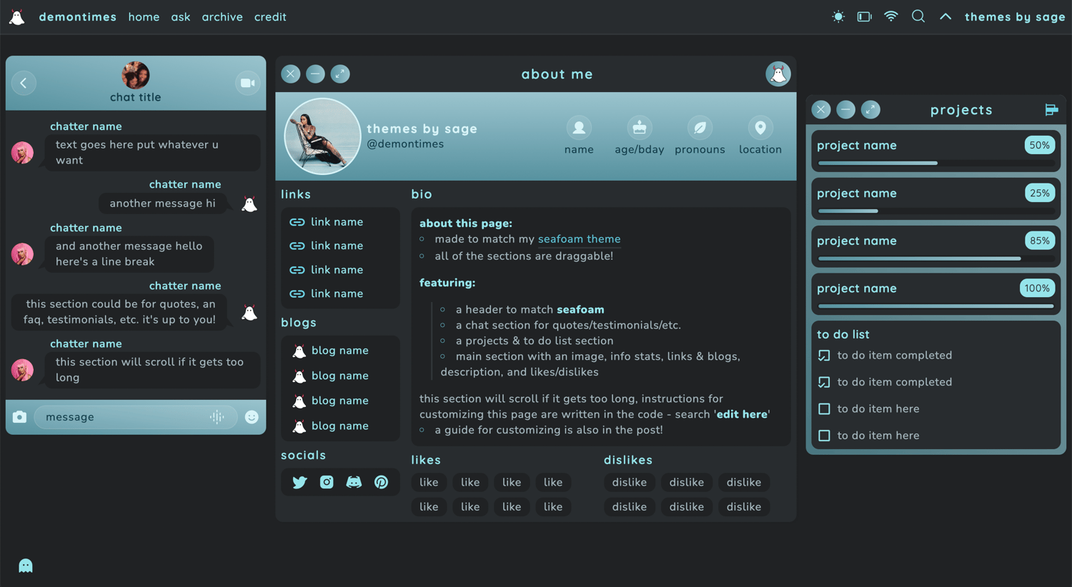 - header that matches seafoam, includes day/night toggle, follow button, an updates tab, search bar, & scroll to top