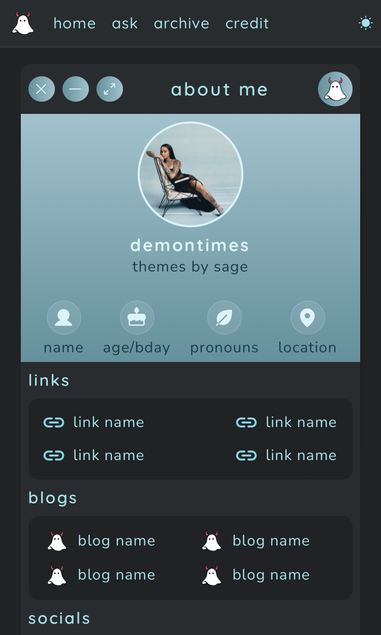 - main section with an image, blog url/title, 4 info stats, links/blogs/socials, a description, and likes/dislikes