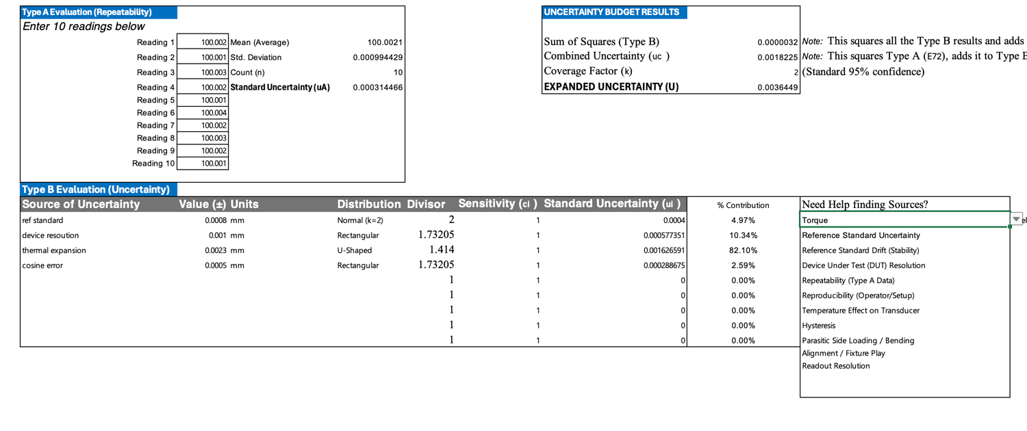 - Built-In Knowledge Bank: Includes a reference library of common uncertainty sources (Hysteresis, Drift, Resolution, Thermal Expansion) categorized by discipline, helping you ensure you haven't missed anything.