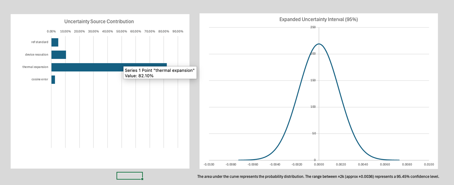 - Visual Dashboard: Automatically generates a Contribution Bar Chart (to see which error source is dominant) and a Probability Bell Curve (visualizing the 95% confidence interval) for your reports.